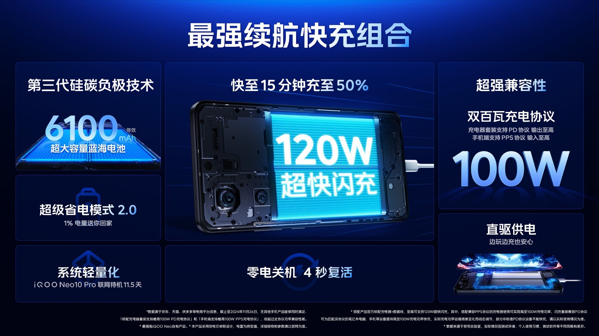 ②闪充:120W超快闪充,快至15分钟充至50%;支持低温直驱供电,边充边玩也安心;充电套装支持至高100W PD协议、手机端支持100W PPS协议,实现超强兼容性。
