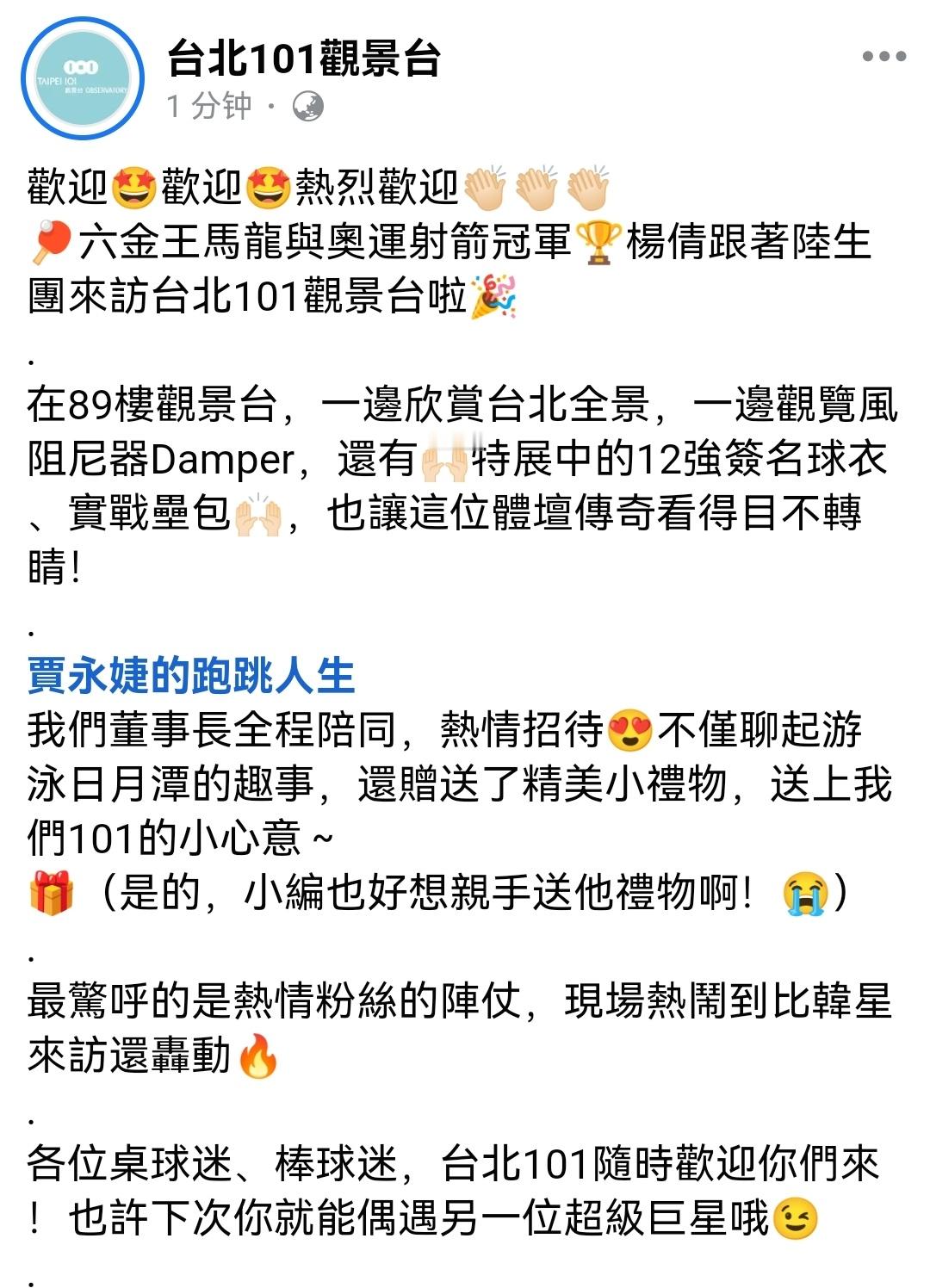 各位桌球迷、棒球迷,台北101随时欢迎你们来