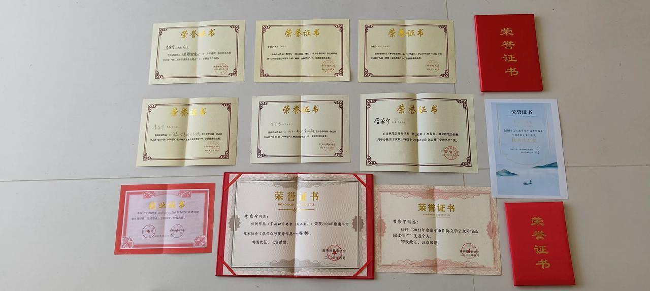 这些奖 李家宁(福建) 这些奖, 是努力与进取的勋章, 心血浇灌,智慧领航。 在岁月的长河里闪亮, 卓越为骨,命气为梁。 每一份荣耀背后的重量, 承载着无数个日夜的奔忙。 是梦想与现实的交响, 是汗水在时光中绽放的光。 而那厚爱的目光, 如星辰在生命的天空高挂。 激励着灵魂永远向往, 向着更高远的境界出发。 在人生的舞台中央, 这些奖,是不朽的诗行。 2024、12、1