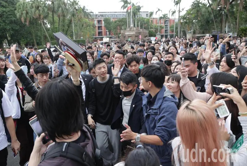 联合新闻 访问团今天到台大参访,逛校园时受到不少学生热情欢迎马龙到访,争先一路跟随拍照、尖叫致意,马龙也不时向粉丝们挥手。