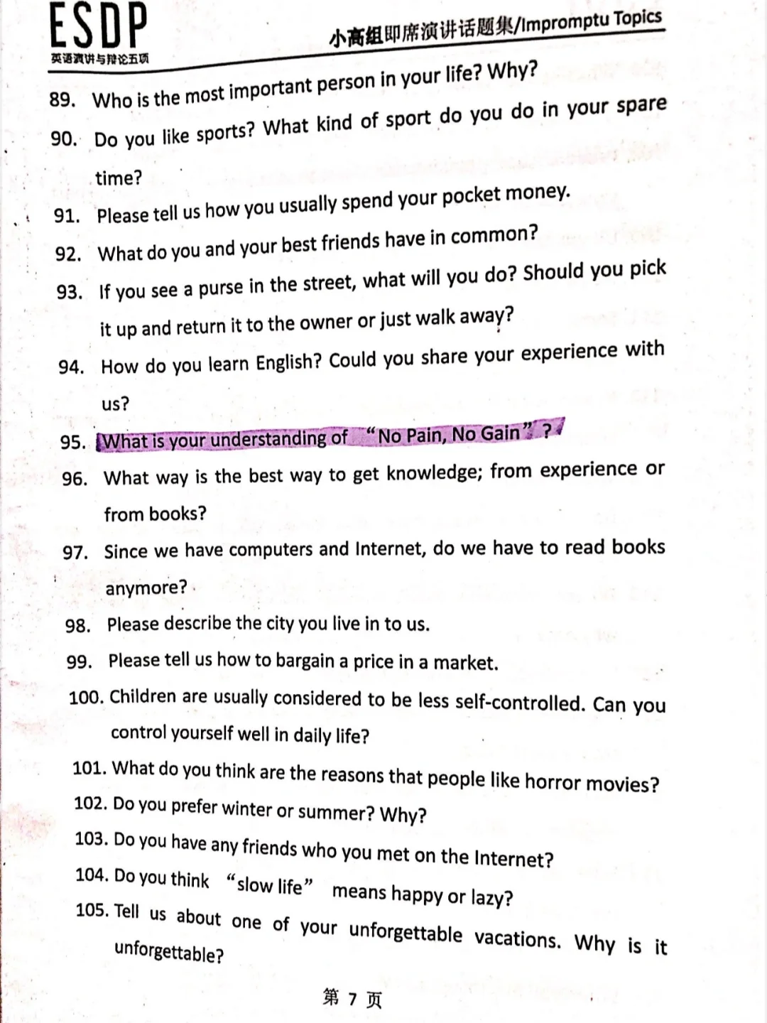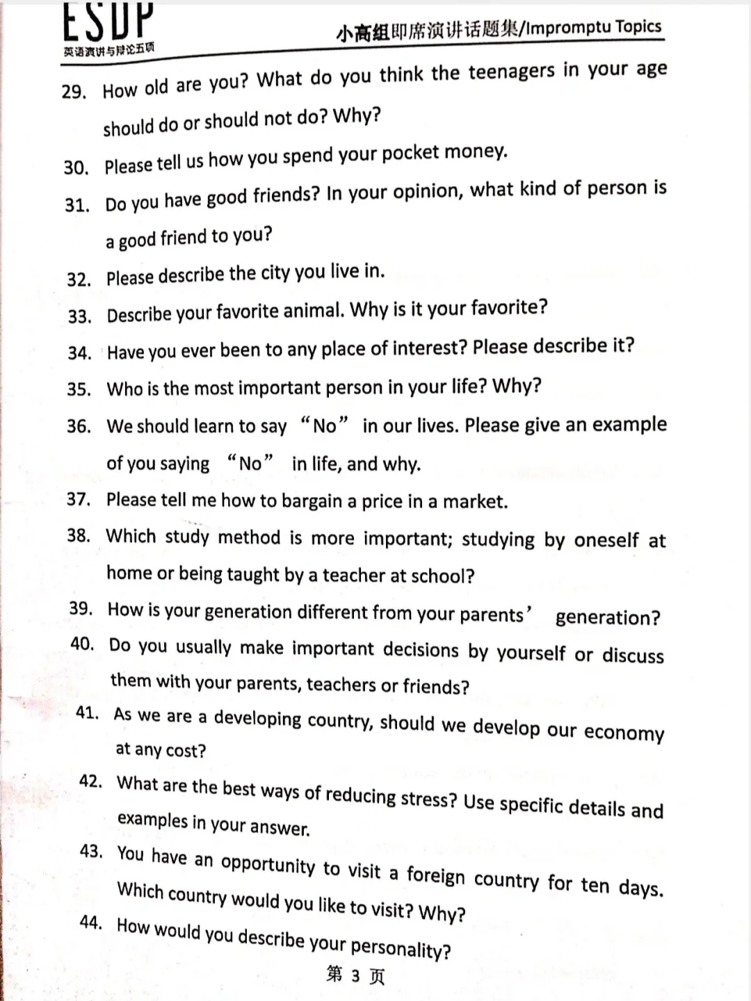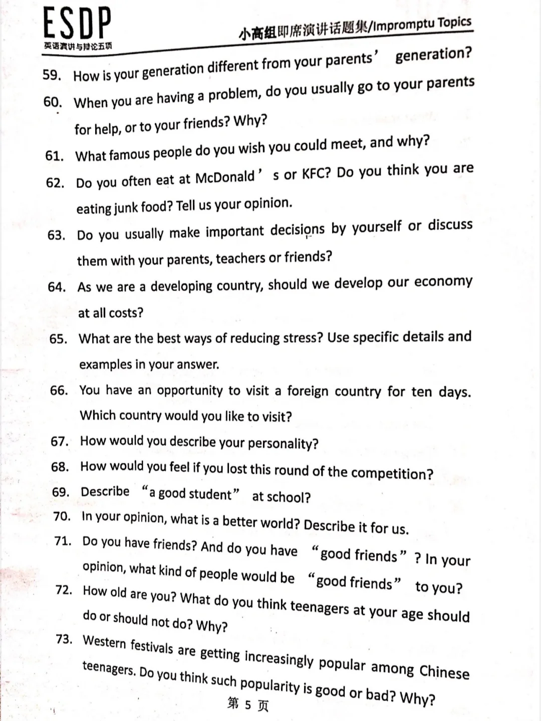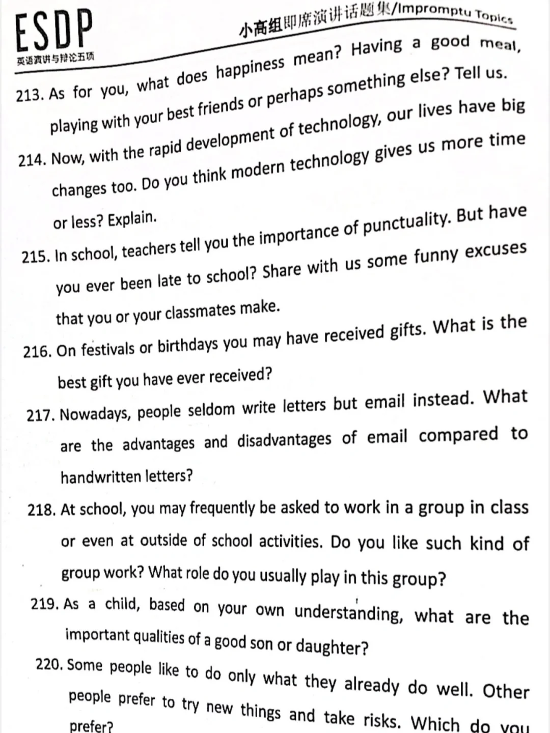 ESDP 小高组英语即兴演讲题库来啦,赶紧练吧