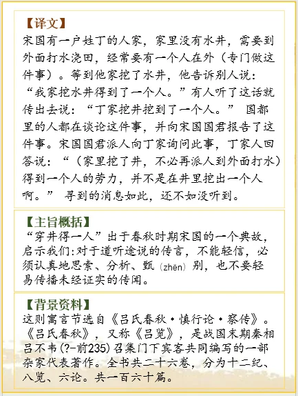 宋国有一户姓丁的人家,家里没有水井,需要到外面打水浇田,经常要有一个人在外(专门做这件事)。等到他家挖了水井,他告诉别人说:“我家挖水井得到了一个人。”有人听了这话就传出去说:“丁家挖井挖到了一个人。” 国都里的人都在谈论这件事,并向宋国国君报告了这件事。宋国国君派人向丁家询问此事,丁家人回答说:“(家里挖了井,不必再派人到外面打水)得到一个人的劳力,并不是在井里挖出一个人啊。” 寻到的消息如此,还不如没听到。