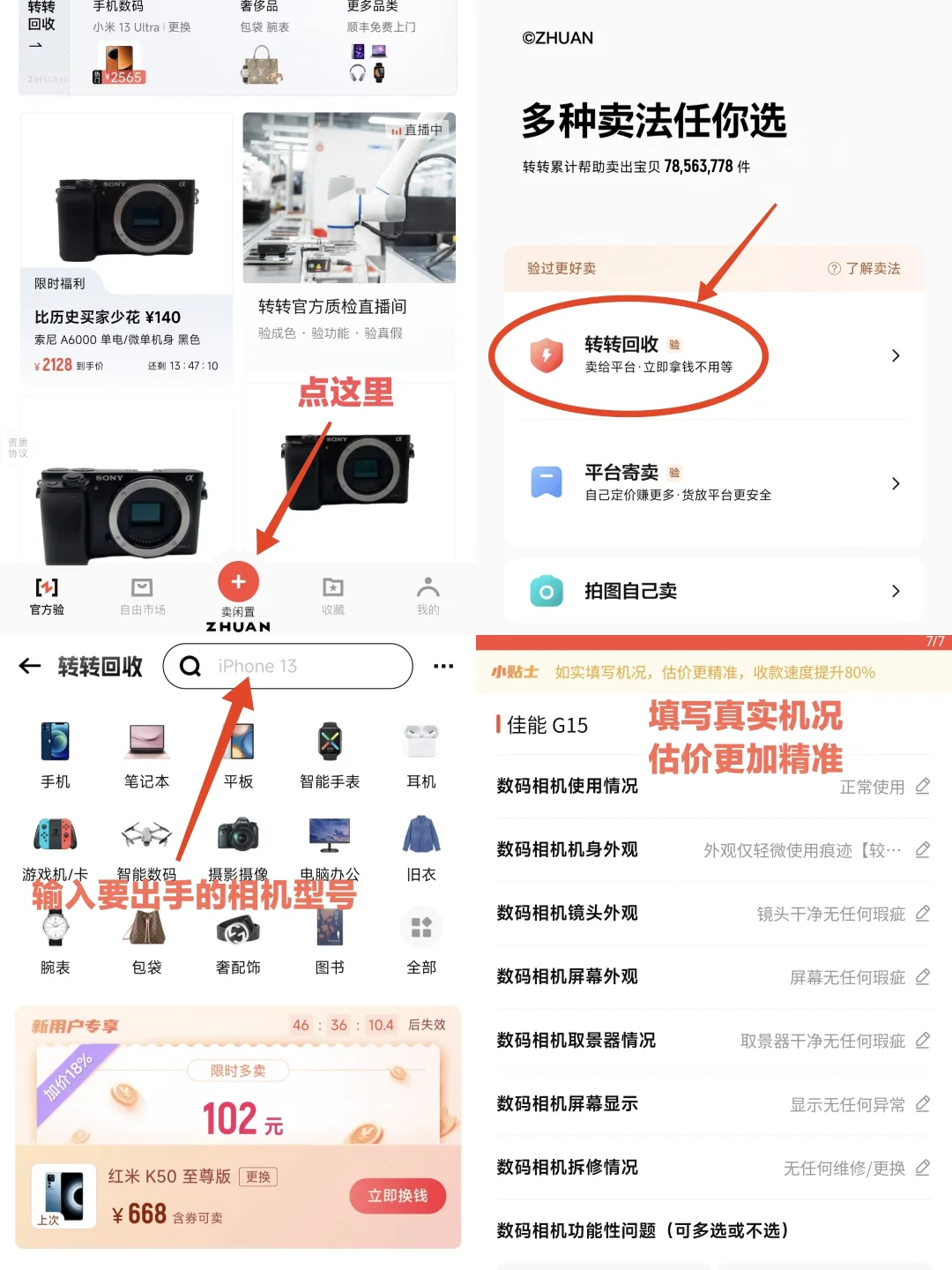 最近在家里翻出一台闲置已久的『佳能卡片机』,于是想到了『转转平台』还有相机回收的业务,于是抱着试试看的心态填写了相机资料(如图8️⃣图9️⃣),结果发现老相机居然还能卖1300多块钱(如图🔟),而且还可以根据自己的时间联系工程师上门回收,工程师当面确认相机成色和价格,觉得价格合适当面打款💰,无需个人处理售后纠纷!非常省事!