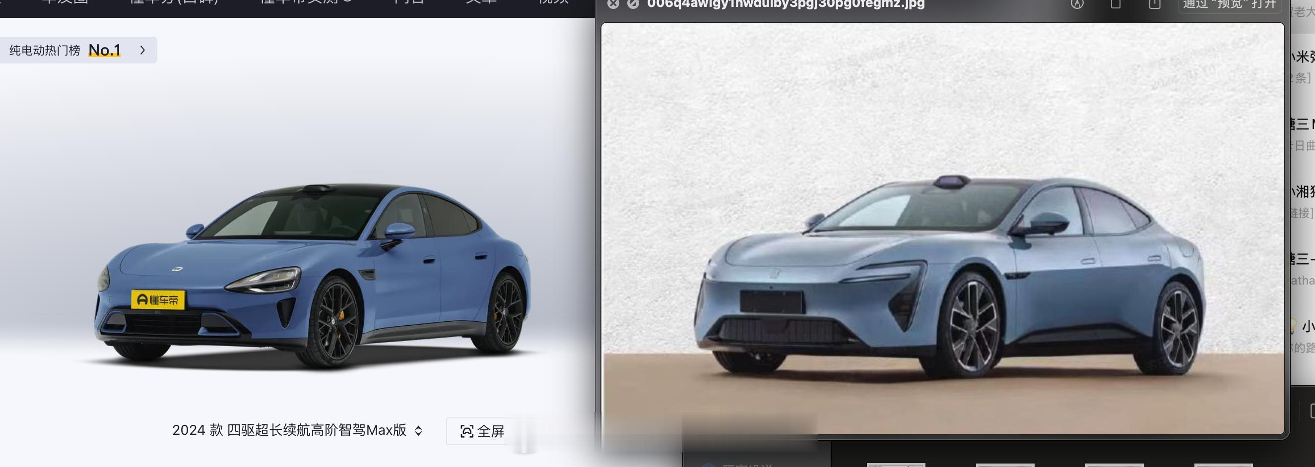 但是细节还是挺多差异,前机盖的曲线比较像,大灯不一样,然后激光雷达造型不一样,整车会多一些线条,,,