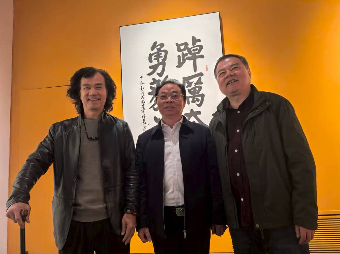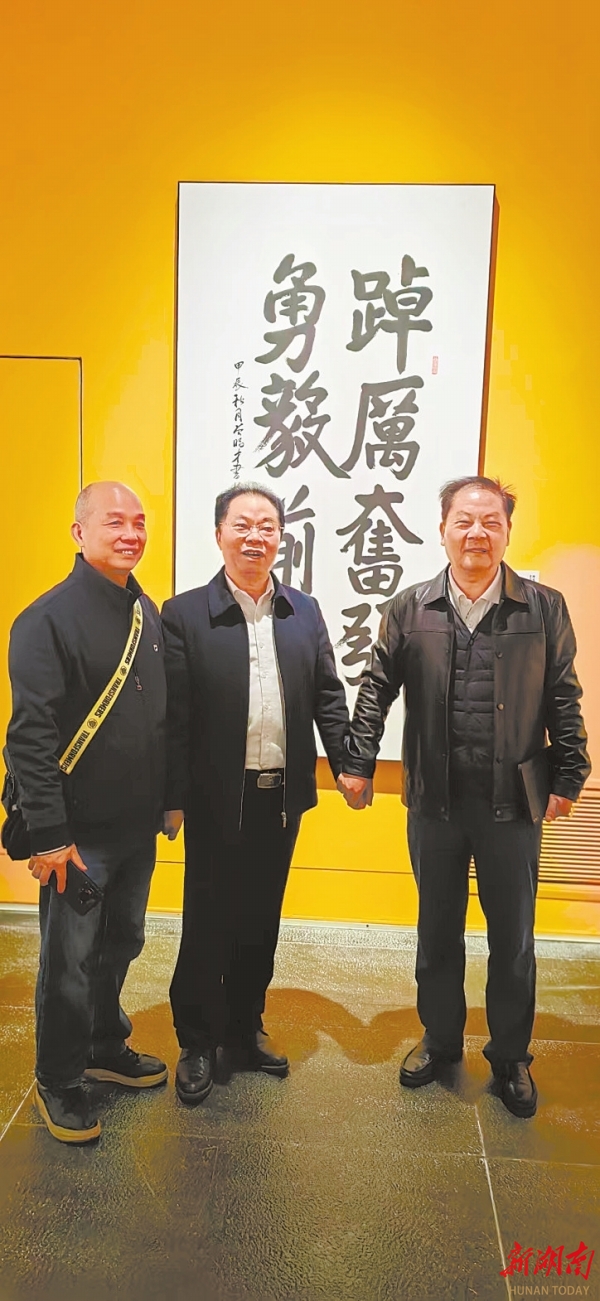 曾昭才(中)及其书法作品亮相“伟业——湖南省主题书法篆刻作品展”。 通讯员 摄