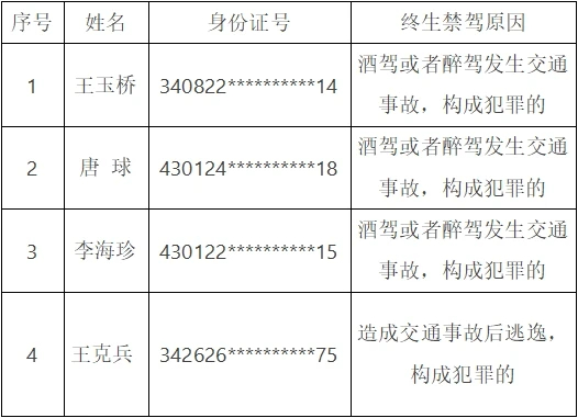 【 长沙4人因酒驾或肇事逃逸终生禁驾 】根据长沙交警最新消息,11月份全市共有4人被终生禁驾。其中3人因酒驾或者醉驾发生交通事故构成犯罪被终生禁驾,1人因造成交通事故后逃逸构成犯罪被终生禁驾。提醒,法律必须遵守,安全不容忽视。驾驶人要主动抵制酒驾醉驾,理性饮酒,拒绝酒驾!
