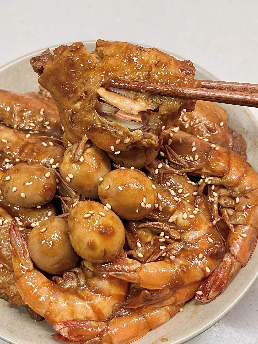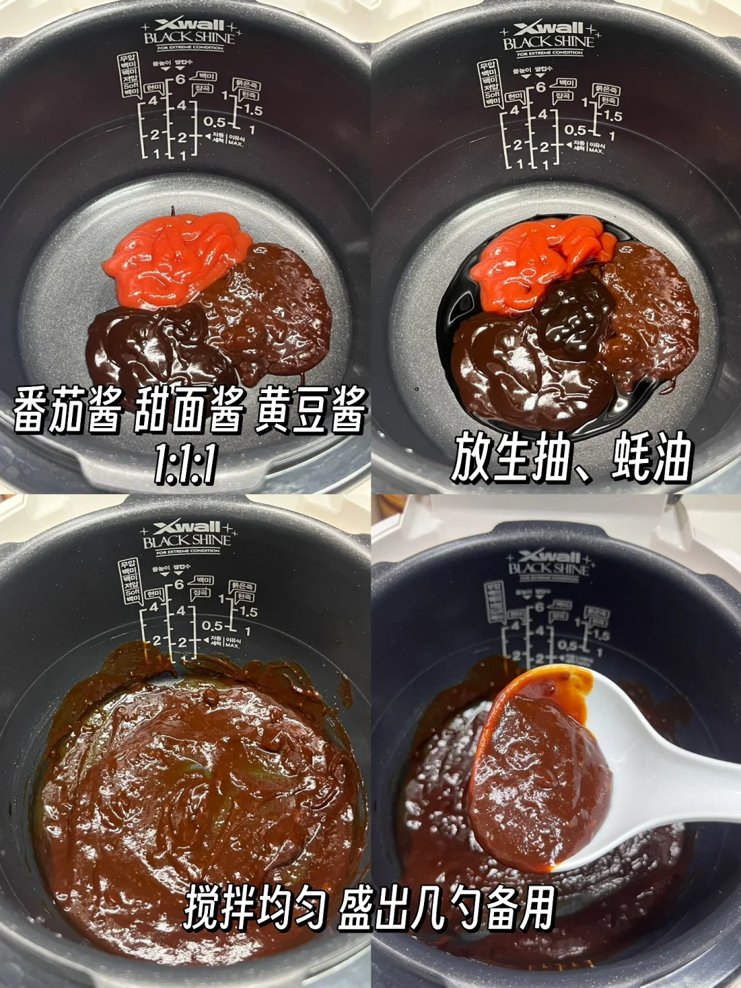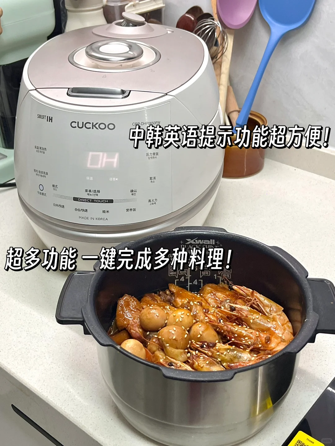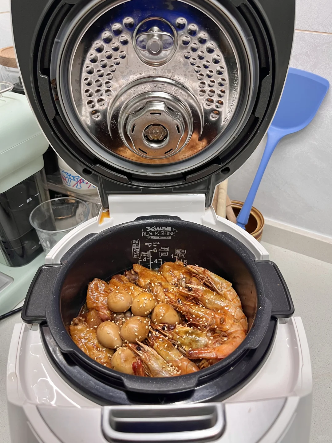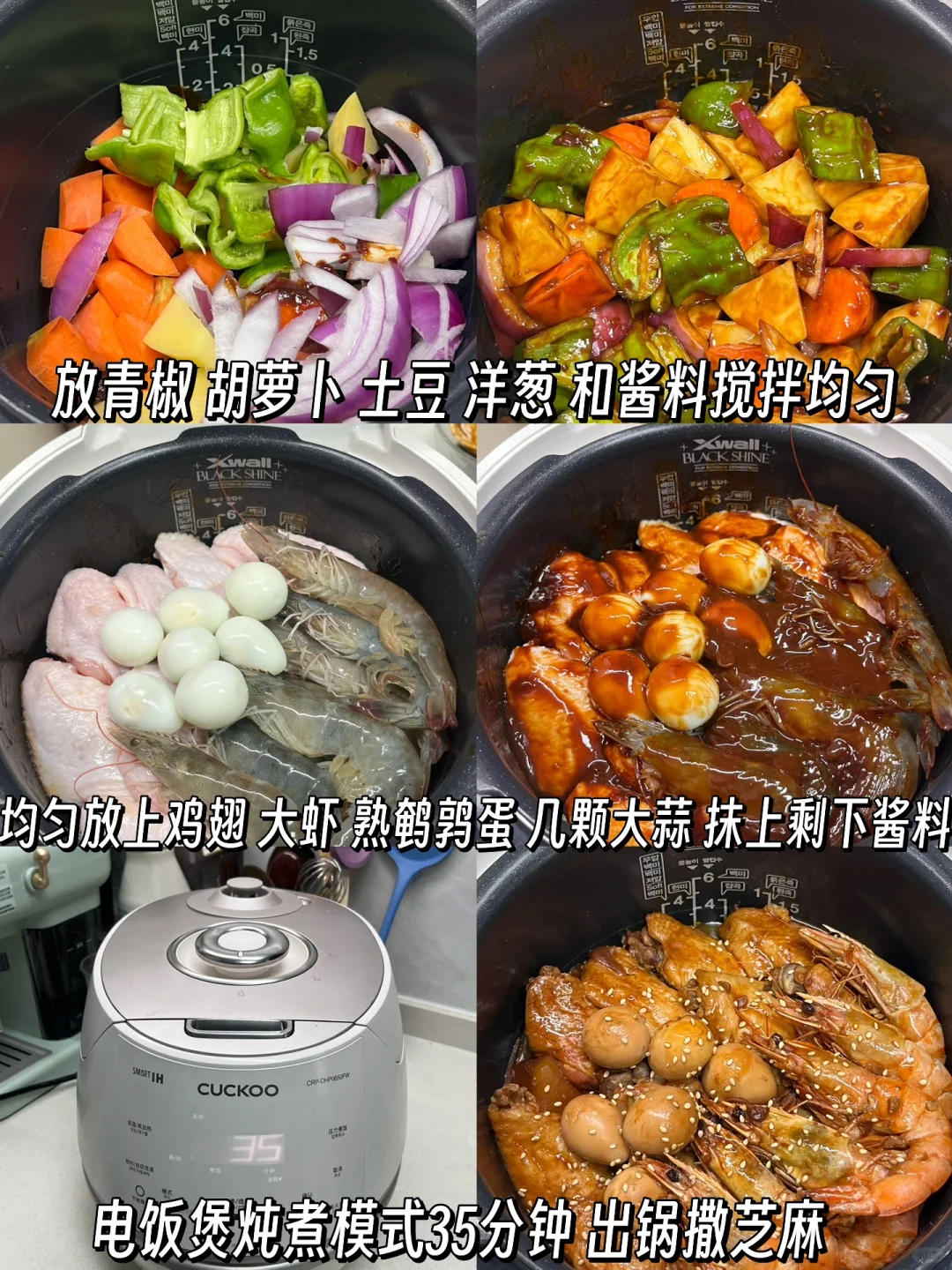 附做法: 1️⃣电饭煲中放番茄酱、黄豆酱、甜面酱1:1:1,加蚝油、生抽,搅拌均匀,盛出几勺备用 2️⃣放入土豆、胡萝卜、洋葱、青椒(喜欢吃的蔬菜),和酱料一起搅拌均匀 3️⃣再均匀放上鸡翅、大虾、熟鹌鹑蛋、几颗大蒜,均匀涂抹剩下的酱料 4️⃣电饭煲炖煮模式35分钟✅出锅撒芝麻 - 电饭煲版的三汁焖锅怎么能那么好吃!超级费米饭🤤 福库电饭煲也是我的老朋友了👫 约2.0倍真高压,能够缩短烹饪时间,快速蒸米饭只需要约13分钟!还有约13小时预约功能,早起上班更轻松便捷👍