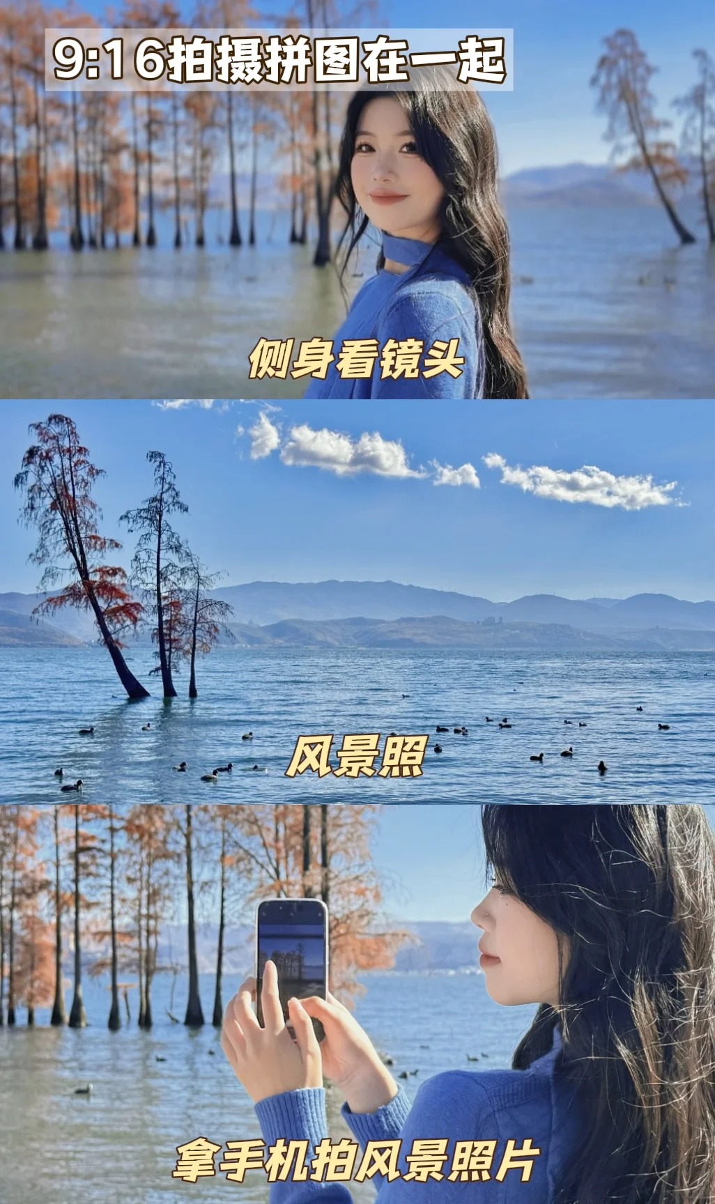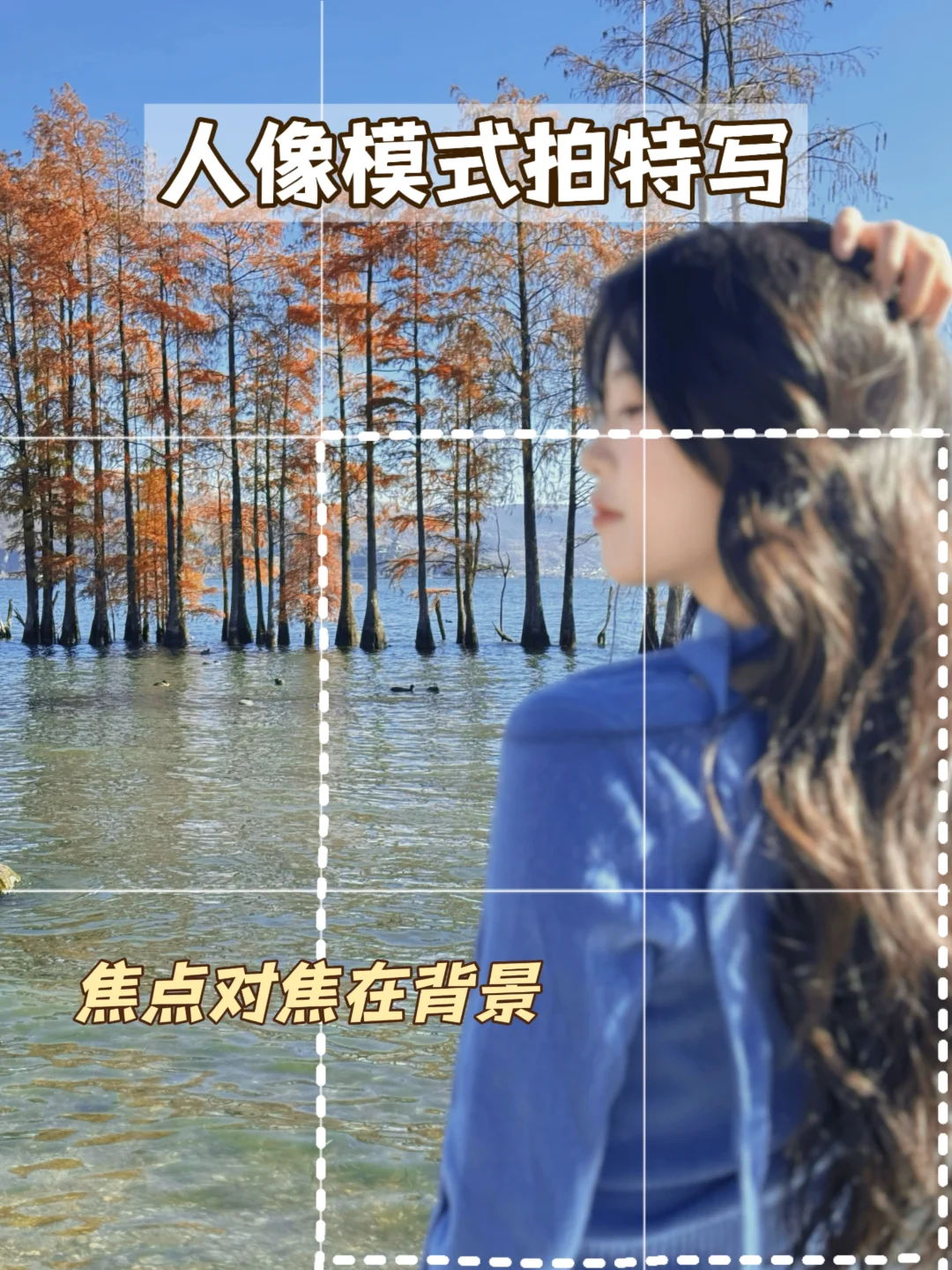 快快1️⃣2倍拍半身 人物放在右下四格 就按照这个构图 怎么拍都不会有废片! 2️⃣1倍拍全身 脚抵最下一格线上 走路抓拍 原地转圈都好看! 3️⃣打开人像模式放大到2倍 焦点对焦在背景 光圈大概调到5.0最合适 氛围感直接拉满 4️⃣拍三张9:16的横屏照片 一张美丽大头照 一张风景照 一张拿手机拍风景照片 三张拼图在一起电影感满满