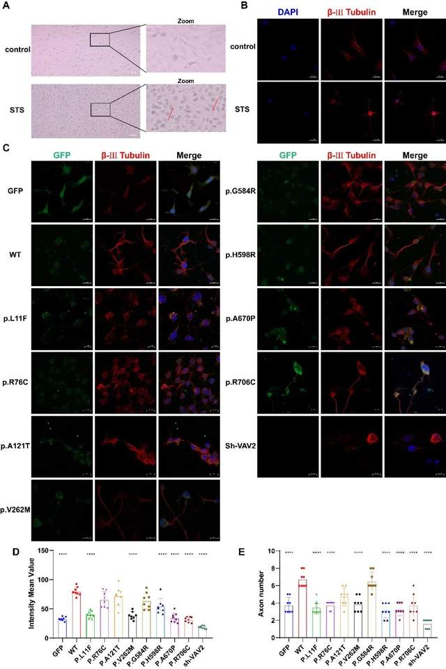 对398例汉族原发性开角型青光眼患者和2010名健康对照者进行了全外显子组测序分析。通过罕见变异负荷检验方法,在VAV2基因中检测到9个罕见变异。研究团队通过多种实验方法验证了VAV2在青光眼发病中的作用机制。单细胞转录组数据分析结合免疫组织化学染色结果证实,VAV2在小梁网和视网膜神经节细胞中存在显著表达。体外功能实验表明,携带致病变异的VAV2蛋白表现出稳定性降低,并影响Rho信号通路的正常激活,进而导致细胞骨架结构异常和神经元轴突发育障碍。为进一步验证VAV2的生理功能,研究团队构建了Vav2基因敲除小鼠模型。这些小鼠在4月龄时出现眼压升高、视盘形态改变和视网膜神经节细胞退化等表型,与人类原发性开角型青光眼的病理特征相符。组织学检查显示,敲除小鼠的小梁网结构发生异常改变,视网膜中与轴突和突触功能相关的蛋白表达水平显著下降。
