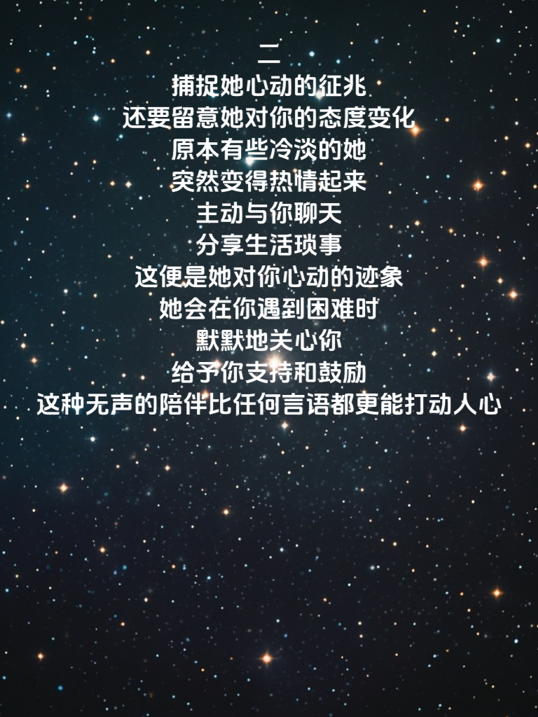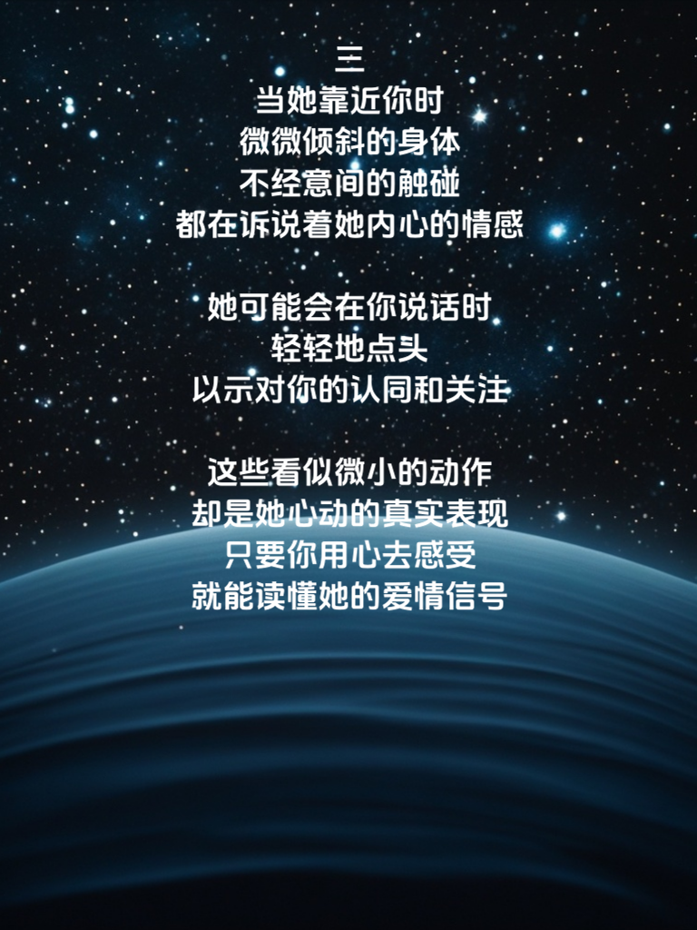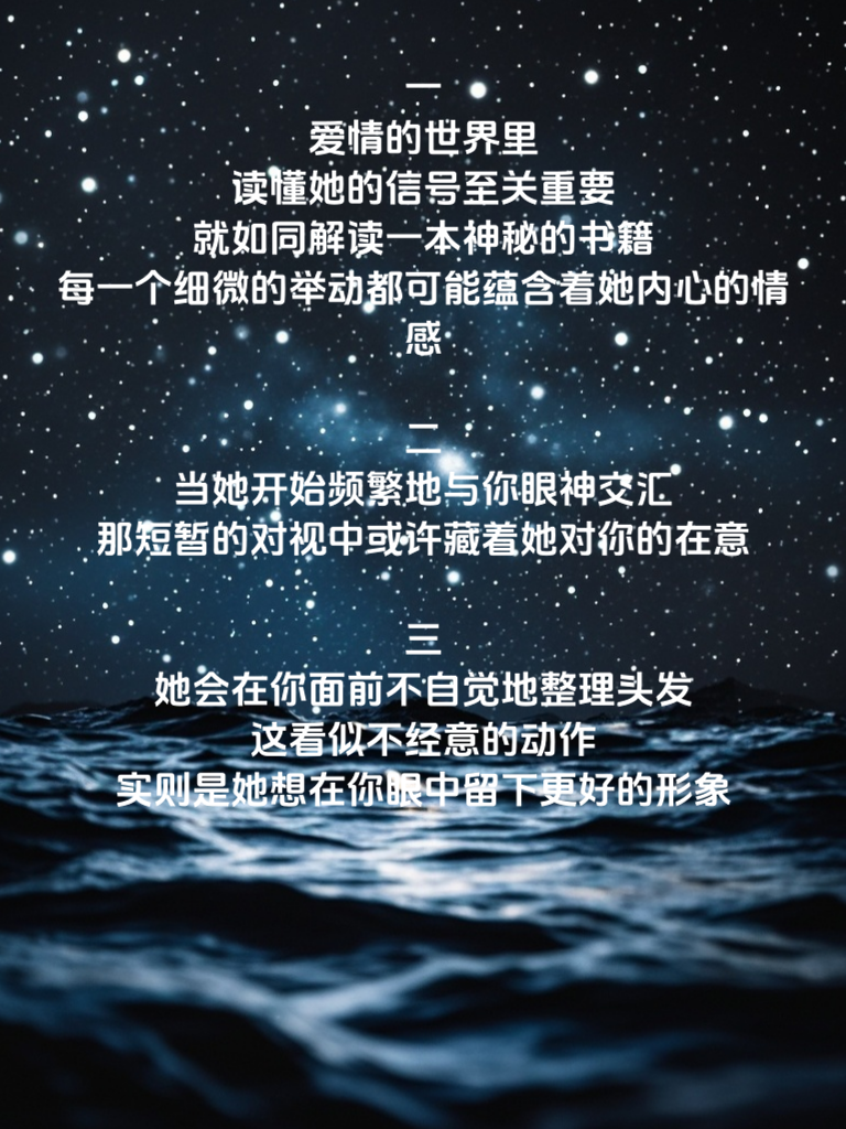 一、爱情的世界里,读懂她的信号至关重要。就如同解读一本神秘的书籍,每一个细微的举动都可能蕴含着她内心的情感。当她开始频繁地与你眼神交汇,那短暂的对视中或许藏着她对你的在意。她会在你面前不自觉地整理头发,这看似不经意的动作,实则是她想在你眼中留下更好的形象。 二、捕捉她心动的征兆,还要留意她对你的态度变化。原本有些冷淡的她,突然变得热情起来,主动与你聊天、分享生活琐事,这便是她对你心动的迹象。她会在你遇到困难时,默默地关心你,给予你支持和鼓励,这种无声的陪伴比任何言语都更能打动人心。 三、最后一招,观察她对你的肢体语言。当她靠近你时,微微倾斜的身体,不经意间的触碰,都在诉说着她内心的情感。她可能会在你说话时,轻轻地点头,以示对你的认同和关注。这些看似微小的动作,却是她心动的真实表现,只要你用心去感受,就能读懂她的爱情信号。