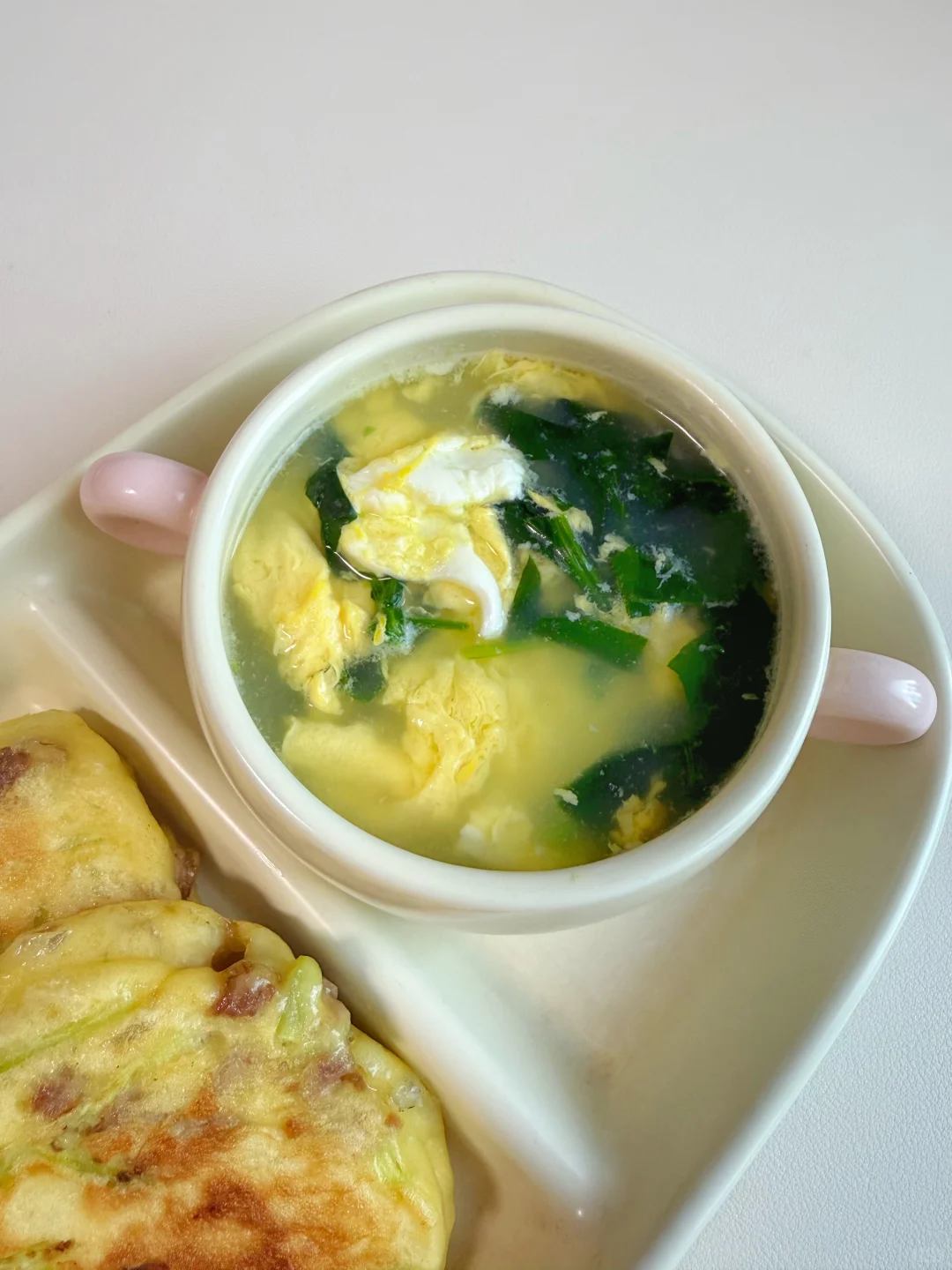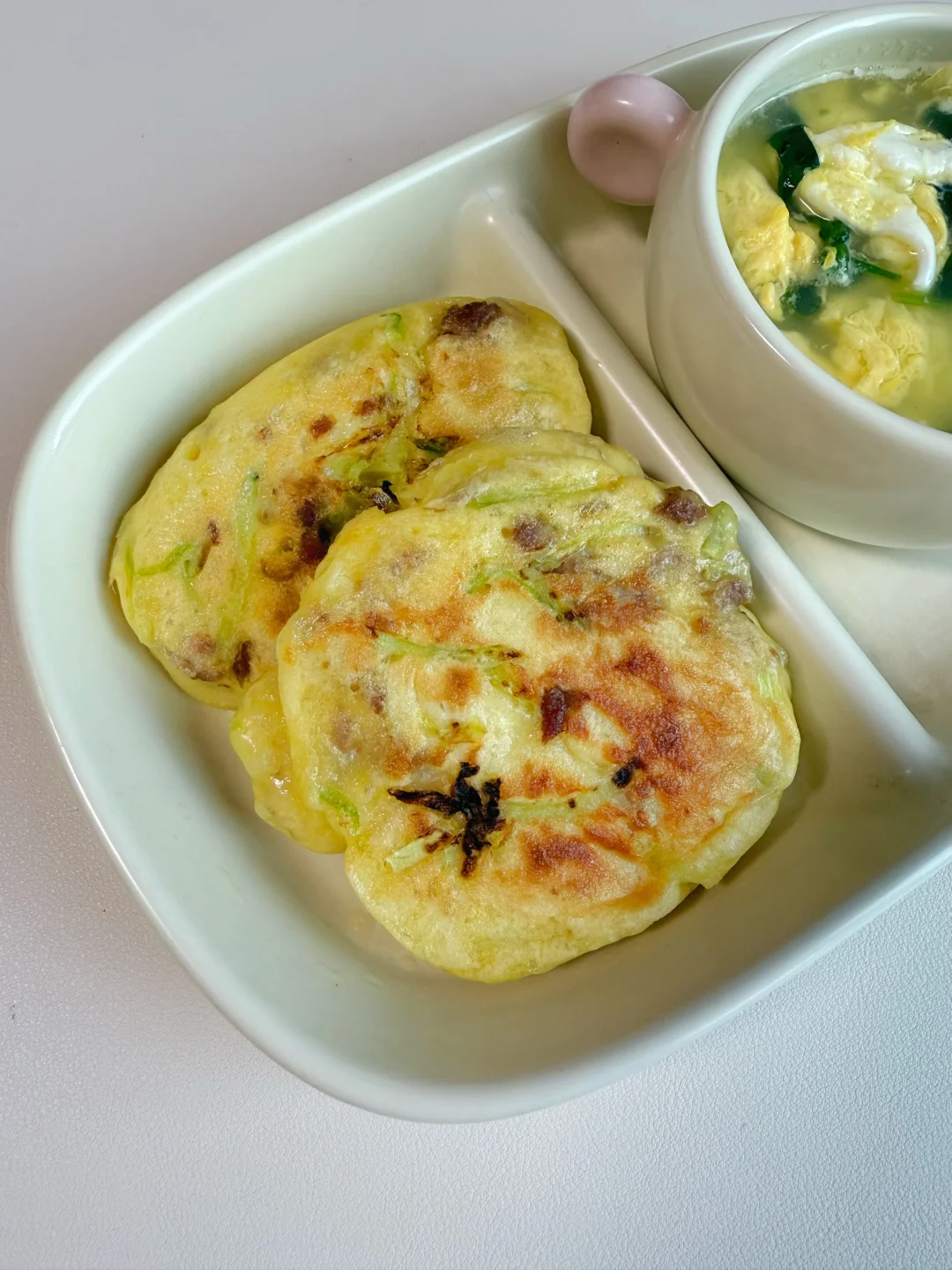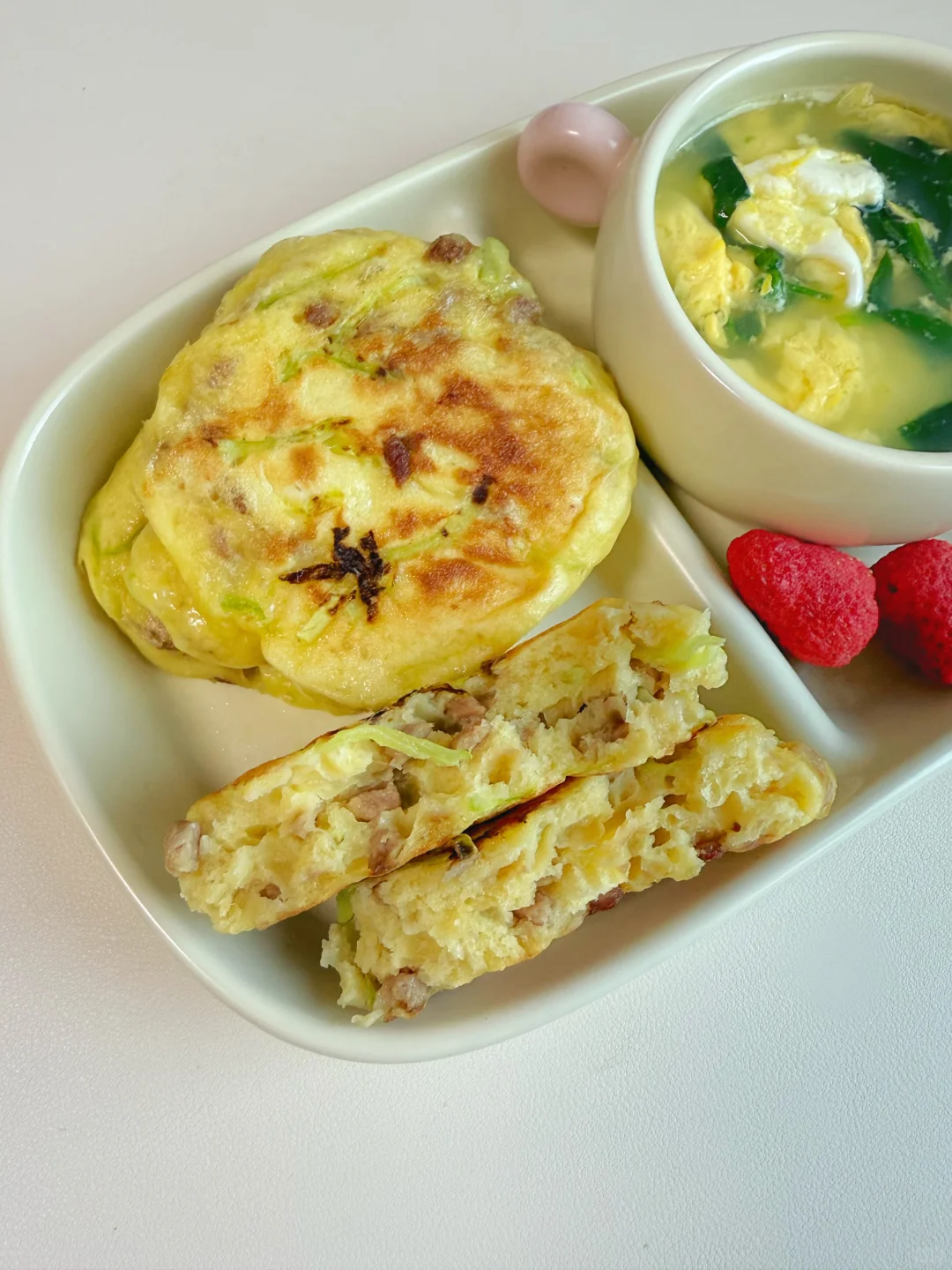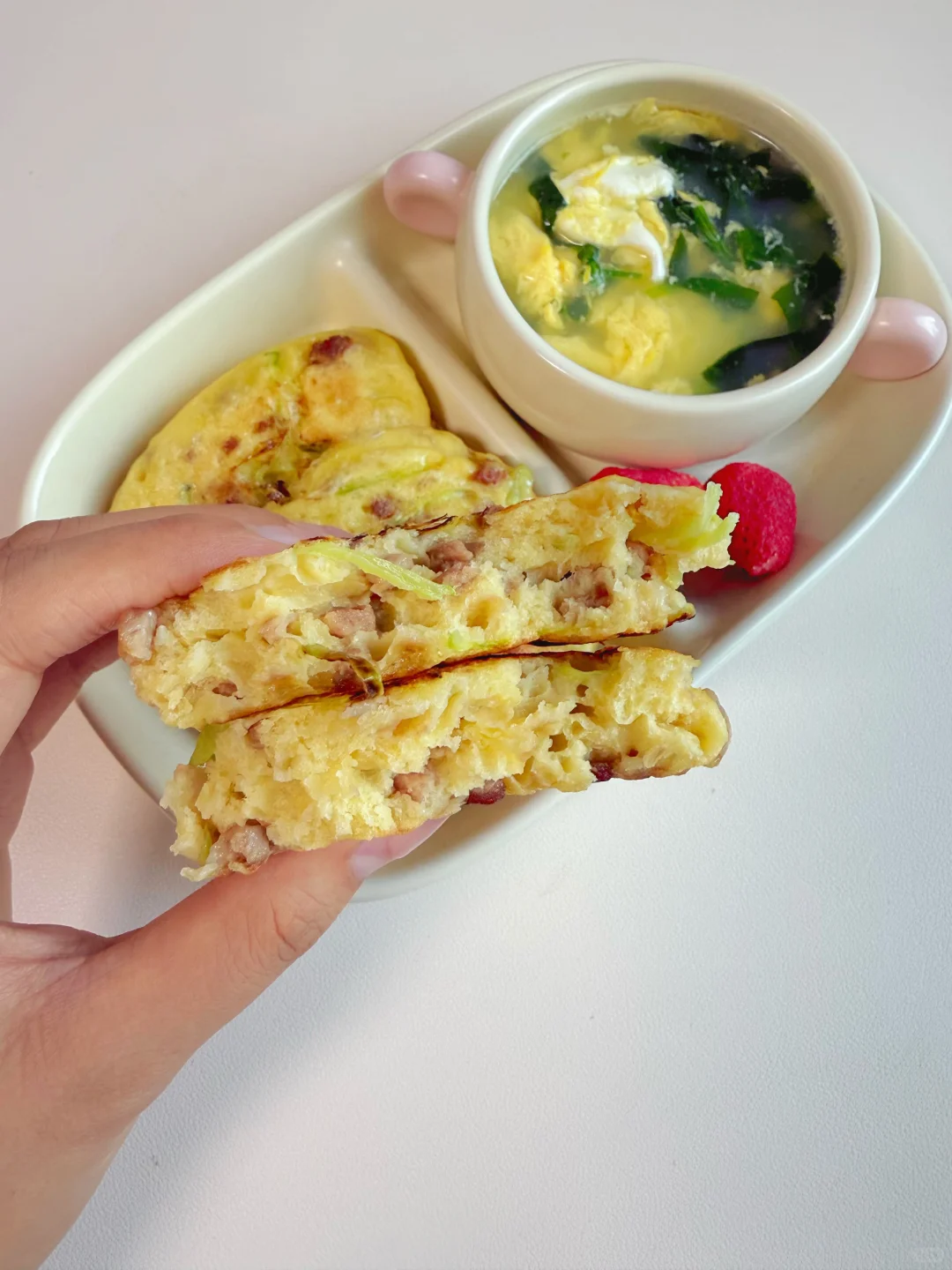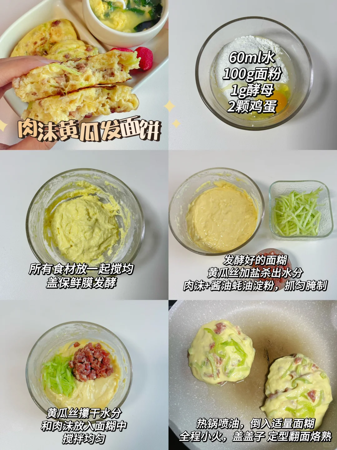 今日早餐分享🍳 肉沫黄瓜发面饼+菠菜蛋花汤 加了黄瓜的发面肉饼,清香好吃 森宝爱吃,给他留一块 晚上又吃一顿 真的超好吃快去做‼️‼️ 面还是提前一晚和好,冰箱冷藏发酵 冬天凉了,早上提前把面拿出来,会发得更好~