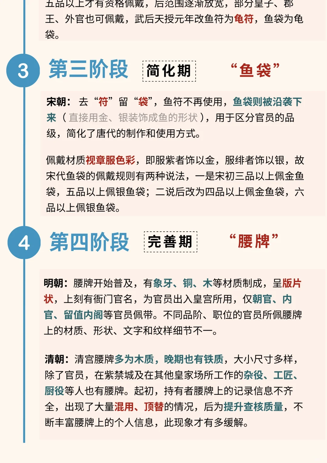 自从腰牌在明清两代普及后,这种以材质、颜色、工艺等细节来区分官位品阶的现象有了明显的弱化,尤其到了清朝,除官员外,紫禁城及在其他皇家场所工作的杂役、工匠、厨役等人也有自己的腰牌凭证,靠配饰信物来证明品阶的情况不再成为主流形式。