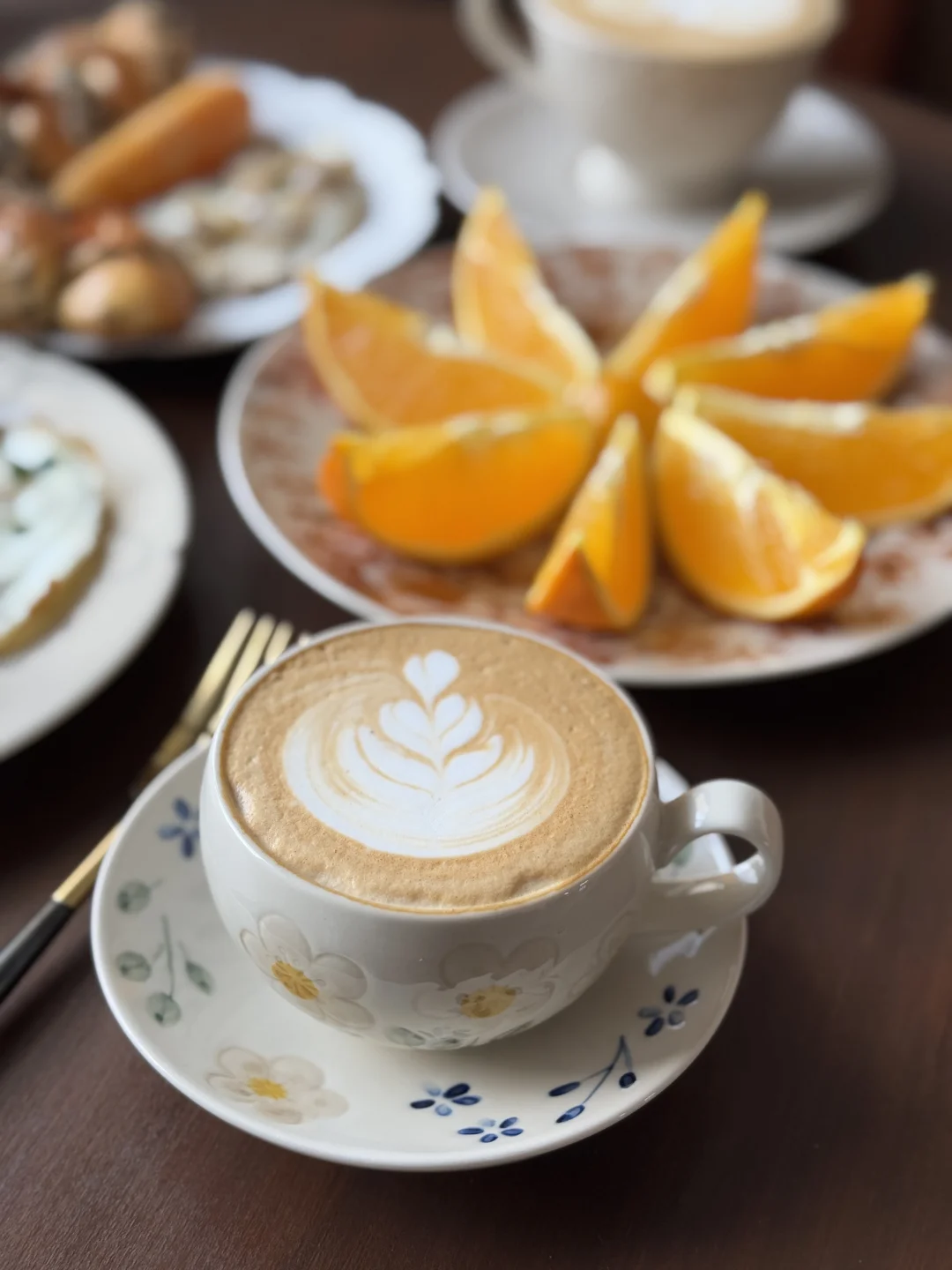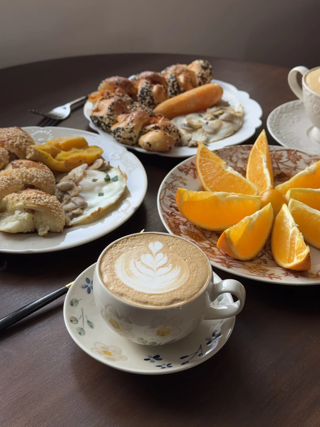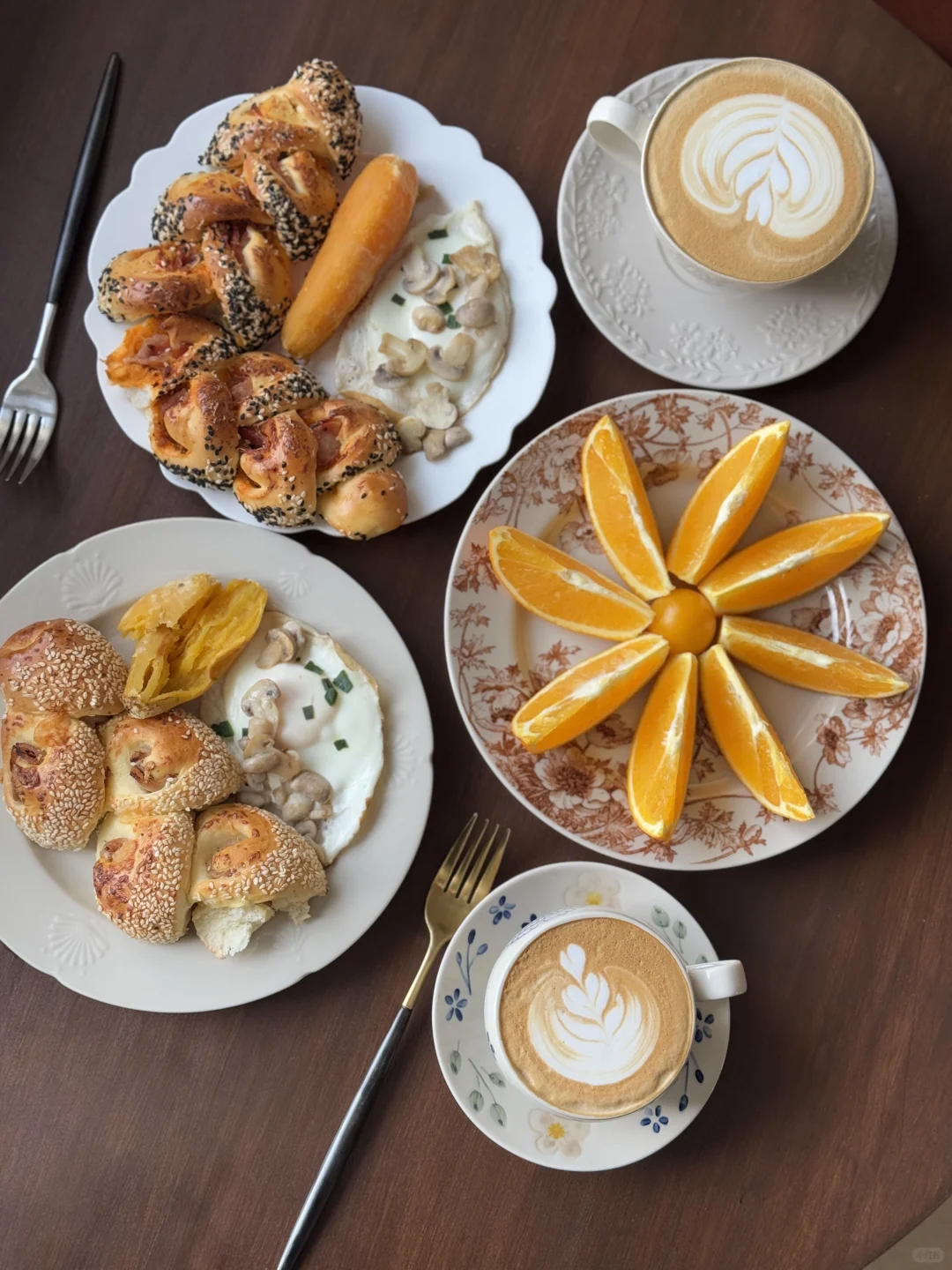 大家新周早安呀~ 昨天买了一些小小的 晚上睡前放进烤箱 预约了烤红薯功能 早上起来直接吃热腾腾的烤红薯 而且烤箱里还热着,直接用余温解冻了面包 冬日的快手热早餐轻松搞定 还有~喜欢今天的拉花