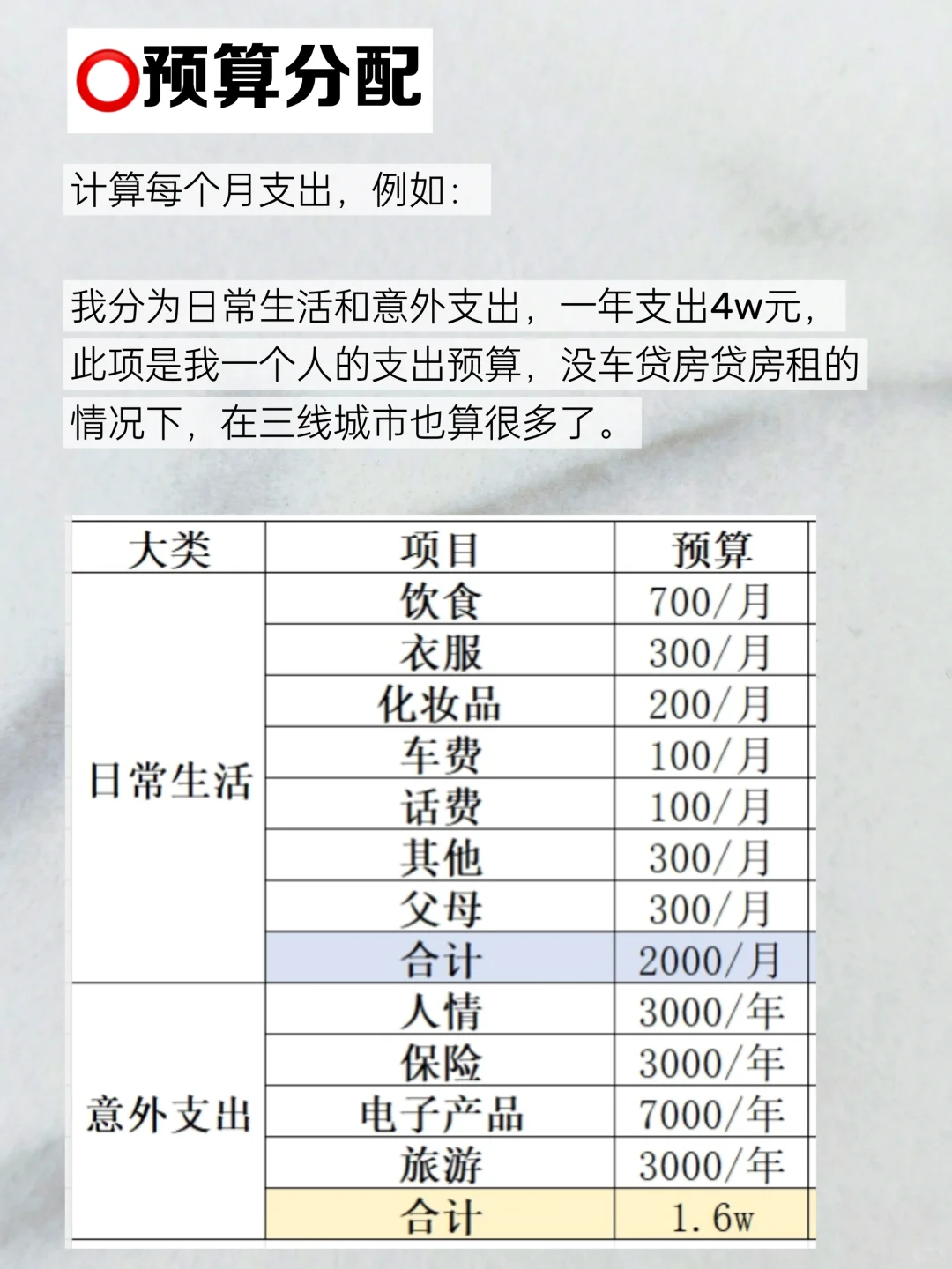 我分为日常生活和意外支出,一年支出4w元,此项是我一个人的支出预算,没车贷房贷房租的情况下,在三线城市也算很多了。