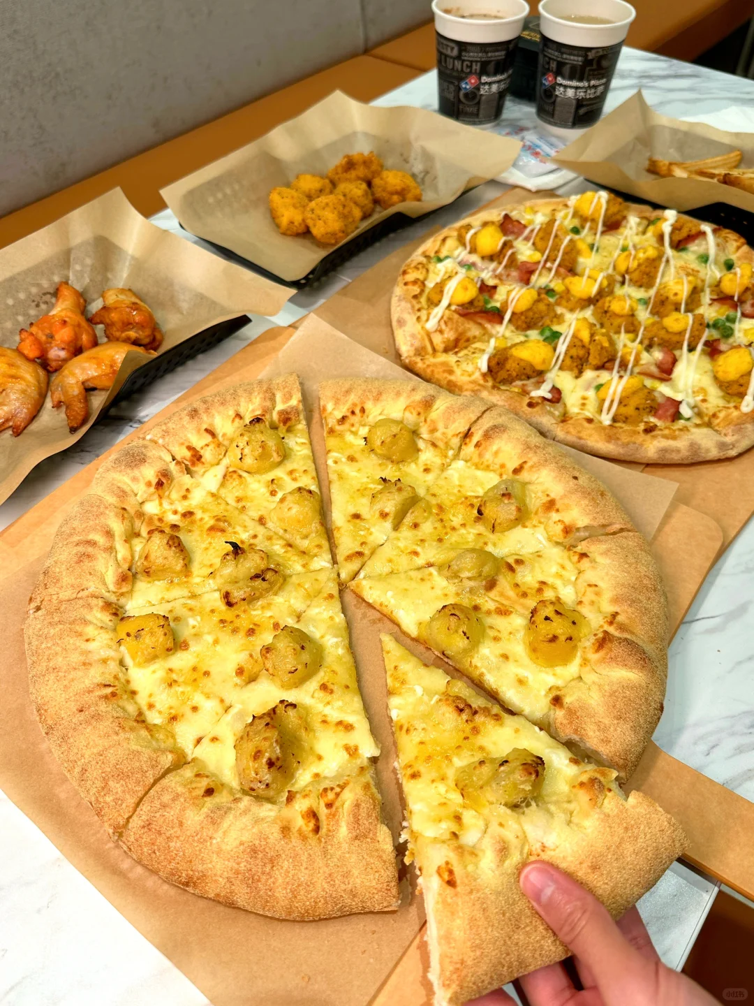 宝子们,达美乐终于终于终于来重庆啦!!! 和姐妹提前吃上了达美乐比萨🍕尊嘟很美味😋 还有比萨人偶 尊嘟太可爱了 一起合拍了几张 点单都是按照上推荐点的 ⭐特别推荐经典手拍苏丹王榴莲比萨🍕!!! 比萨上还有一块一块的榴莲果肉 一口下去真的不要太满足❗双层芝士卷边真的很过瘾❗想安利给大家! 开业活动: 12月21日 - 12月30日,9寸比萨免费升级12寸! 再也不用去外地吃达美乐啦 尊嘟很幸福🥰