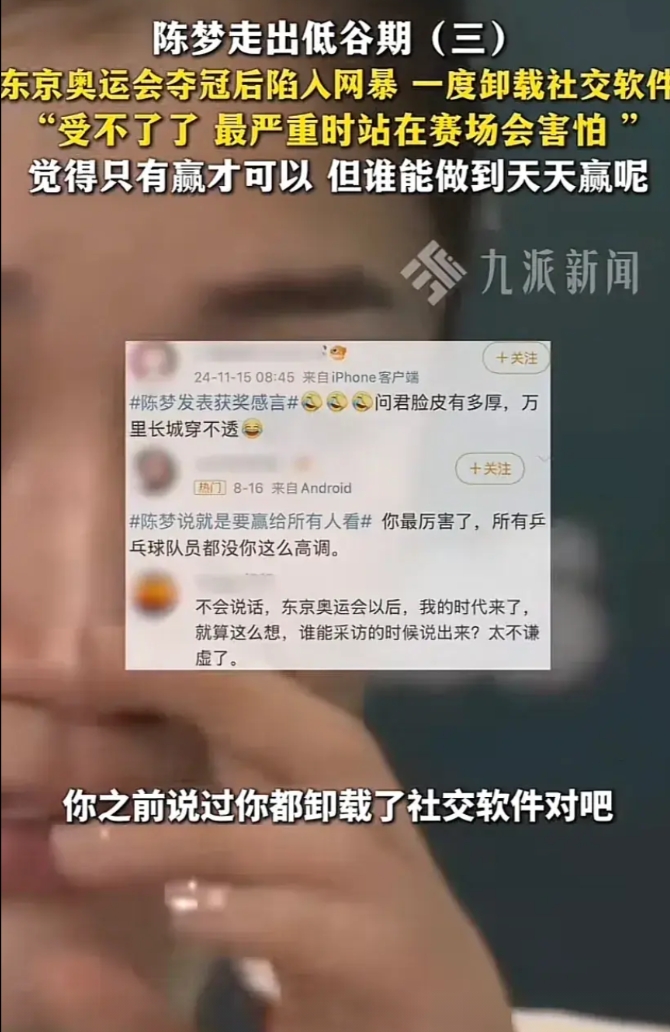 陈梦:东京奥运会夺冠了,但是社交媒体,网络的发酵让我很崩溃,差点卸载了社交媒体。害怕站在赛场,但是也怕失败,好像只有天天赢,才能不辜负所有人,但是谁又能天天赢呢? 这是奥运冠军陈梦接受采访时说的,那一天,她夺得了冠军,没想到场上却在骂她,真的搞不懂啊! 幸好陈梦挺过来了,祝福她越来越好[比心]