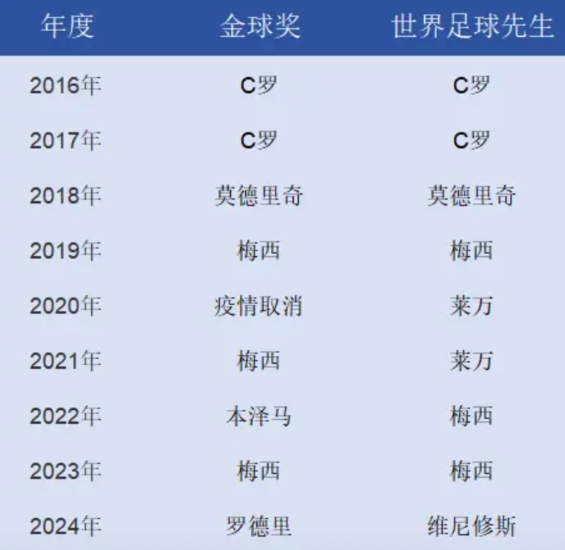 另外三次背离,分别是2021年金球奖是梅西,世界足球先生是莱万;2022年金球奖是本泽马,世界足球先生是梅西;2024年金球奖是罗德里,世界足球先生是维尼修斯。