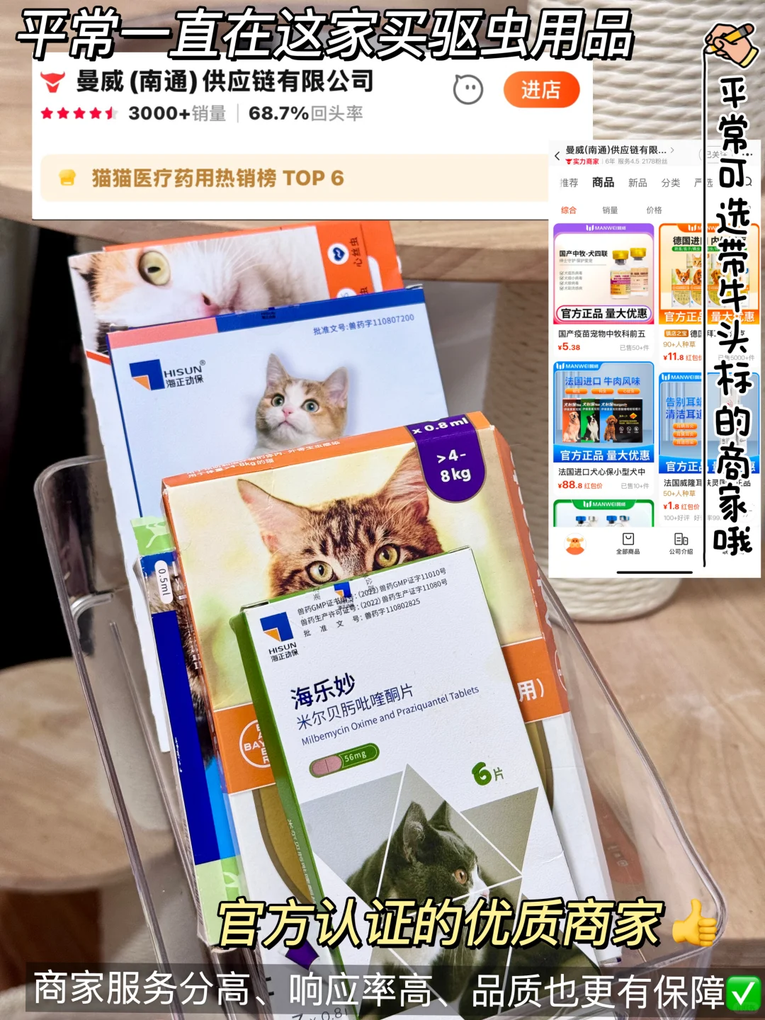 [自拍R]里面各种东西都比某宝和PDD划算太多了,简直随时都是大促啊,本来还担心品质问题,结果发现只是少了中间商赚差价,我就是在1688上面的必采榜里选择了榜单前10名的店—曼威(南通)供应链有限公司。给毛孩子入手了一些常见驱虫药,都是正品✌,这一个月又能省大几百的。而且他家3000+的销量居然有高达68.7%的回头率,这么高的回头率,他家产品靠不靠谱也不用我多说了吧。