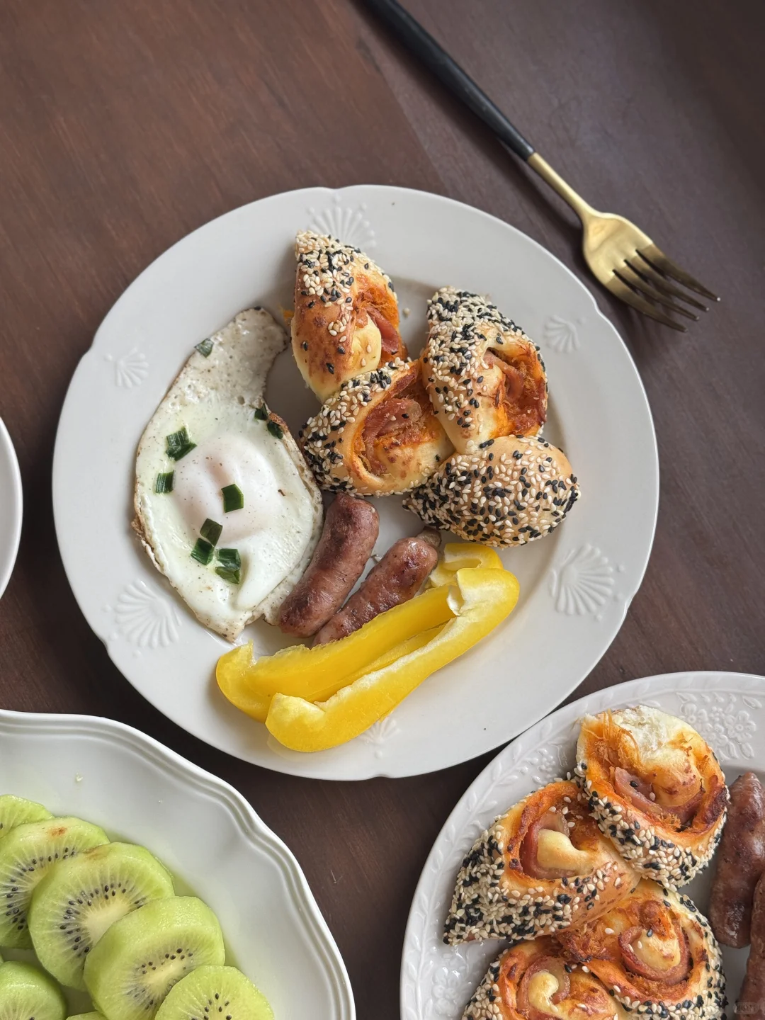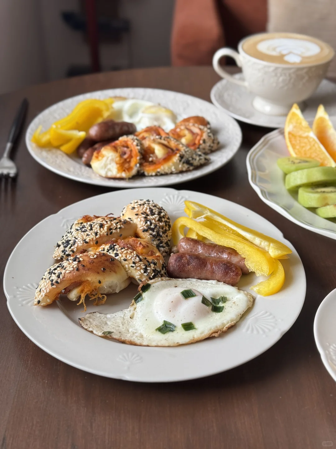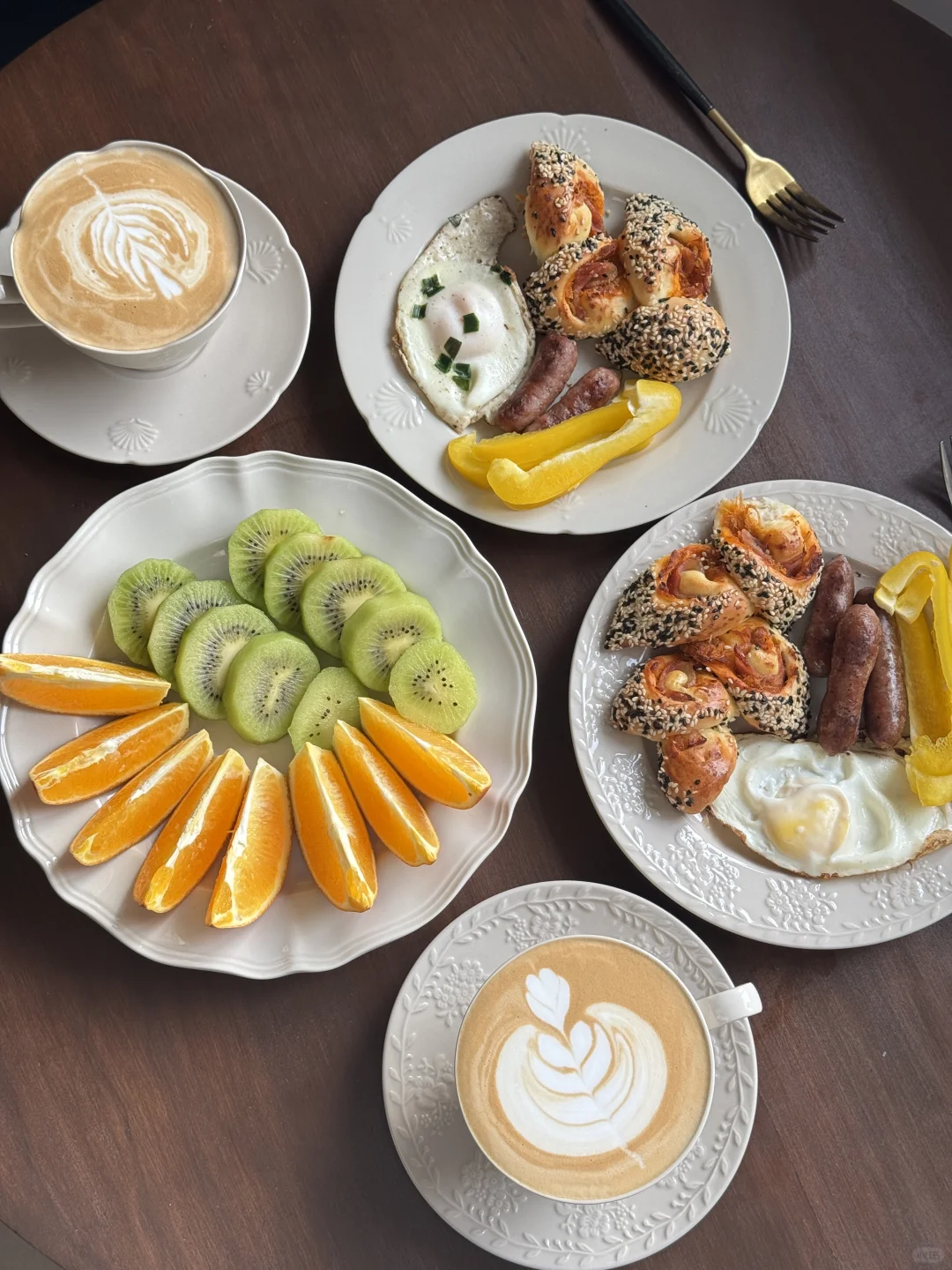 最近总是心不在焉的 做了早餐吃完都忘记发 可能冬天就是会让人慢半拍吧[扯脸H] 今日早餐: 培根麦穗面包 煎蛋🍳脆皮肠🥓甜椒🫑 水果:猕猴桃🥝橙子🍊 还有不能错过的拿铁☕️ 早晨发现没有牛奶了 赶紧去楼下的鲜奶站买了一瓶A2 今日份的拿铁是甜甜的[太阳R]