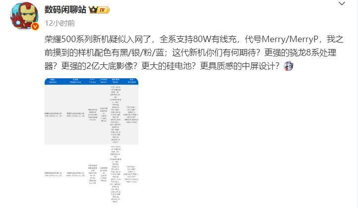 日前,数码博主“数码闲聊站”晒出了一张新机获得国家质量3C认证的截图,并配文称,“荣耀500系列新机疑似入网了,全系支持80W有线充,代号Merry/MerryP,我之前摸到的样机配色有黑/银/粉/蓝;这代新机你们有何期待?更强的骁龙8系处理器?更强的2亿大底影像?更大的硅电池?更具质感的中屏设计?”