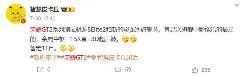 据“数码闲聊站”和“智慧皮卡丘”爆料,荣耀GT2系列新机有可能搭载高通骁龙8 Gen5处理器,将内置容量在9000mAh±超大容量新款硅电池,配备金属中框、IP68/IP69防水等级以及3D超声波指纹识别。该机还将采用1.5K护眼直屏,后置5000万像素索尼主摄与1200万像素超广角微距镜头。综合来看,这款机型在性能和续航方面都表现出色,定价预计在两千多元,性价比颇具吸引力。