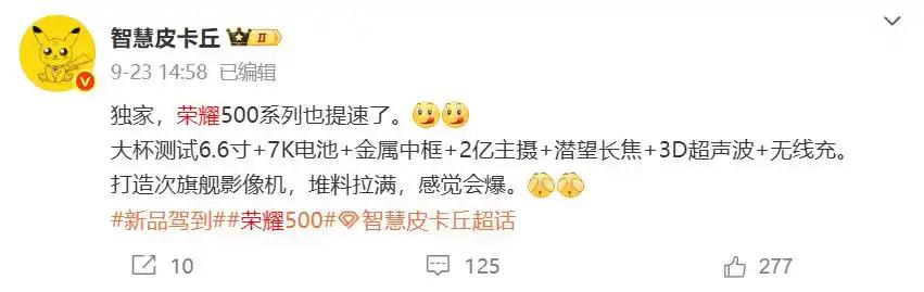 此外,曾有数码博主爆料过疑似荣耀500系列的部分核心配置,据“智慧皮卡丘”爆料,荣耀500系列提速了,其中Pro版有望采用6.6英寸屏,内置7000mAh电池,采用金属边框,后置2亿像素主摄,支持潜望长焦、3D超声波指纹、无线充等,官方旨在打造次旗舰影像机,堆料拉满。而据“数码闲聊站”爆料,该机的将配备6400万像素OV64B潜望长焦(支持3X光变),号称“电池是同档最大”。