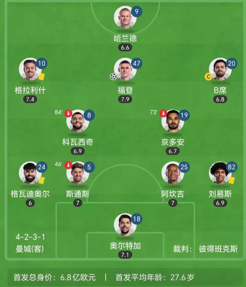曼城1-2维拉,掉出欧战区!盘点曼城4-2-3-1阵型: (1)门将:奥尔特加; (2)后卫:格瓦迪奥尔、斯通斯、阿坎吉、刘易斯; (3)中场:B席、京多安、科瓦西奇; (4)前场:哈兰德、福登、格拉利什。