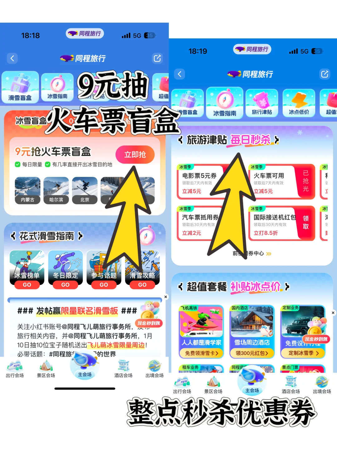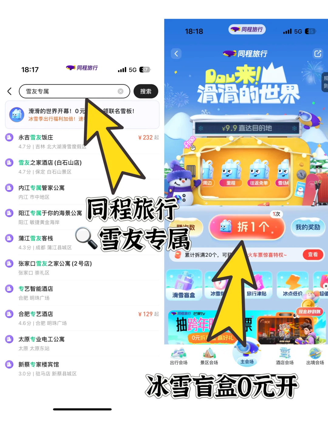 📝出发前必看❗同程旅行,🔍【雪友专属】,免费领取 300 元暖冬酒店礼包,还有 0 元冰雪盲盒等你开启,更有 9 元火车票盲盒助你直达心仪目的地。超值福利,快来薅羊毛啦❗