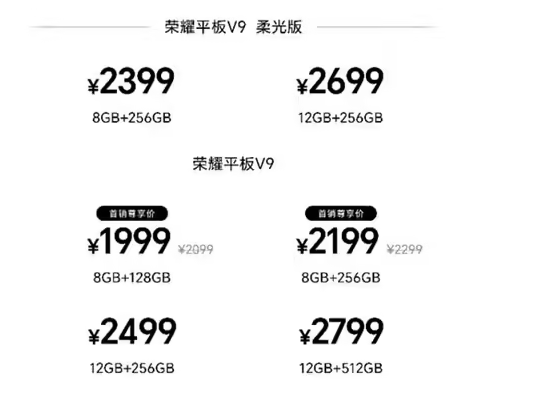 荣耀平板 V9 在荣耀商城、各大授权电商、荣耀体验店、授权零售门店正式开售, 共包括 8GB + 128GB、8GB + 256GB、12GB +256GB、12GB +512GB 四种配置, 首销优惠价 1999 元起。其中 8GB +256GB 和 12GB +256GB 还有柔光屏版本可供选择。