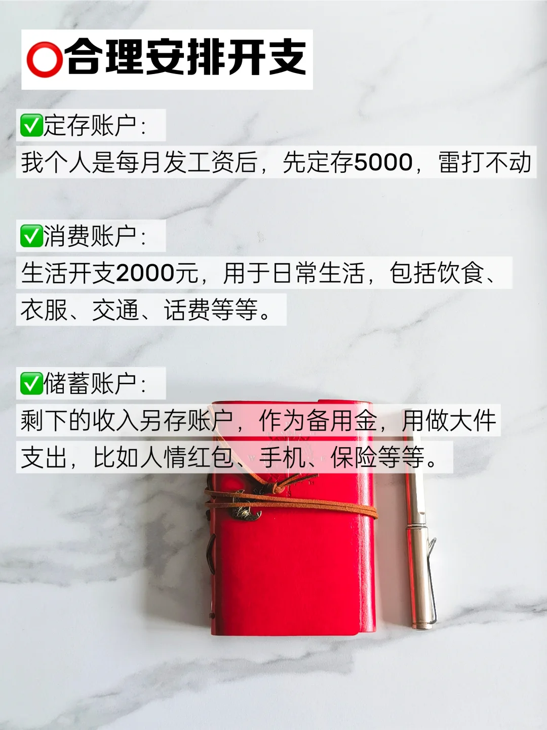 ✨储蓄账户:剩下的收入另存账户,作为备用金,用做大件支出,比如人情红包、手机、保险等等。