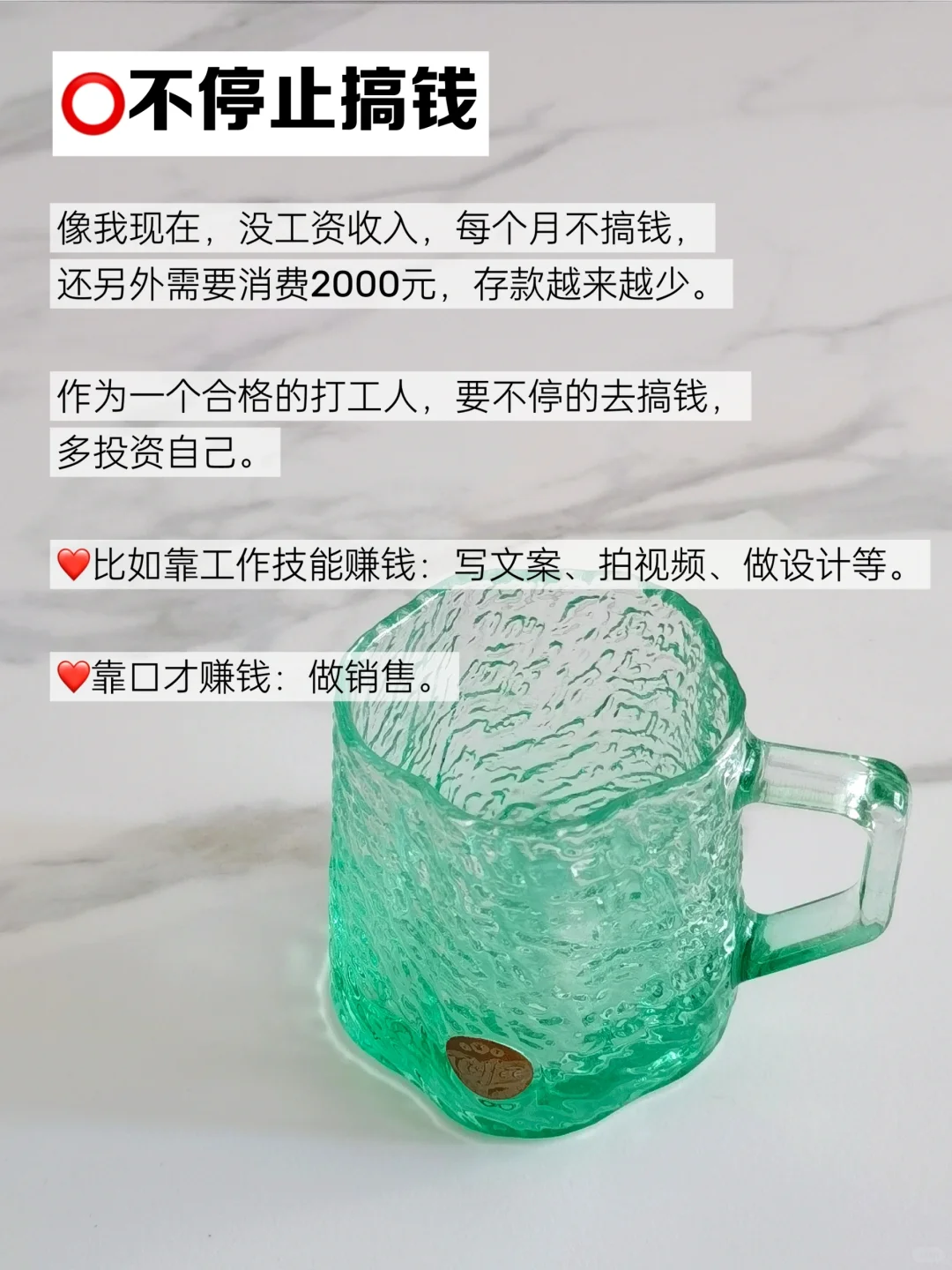 ✔靠工作技能搞钱:写文案、拍视频、做设计等。