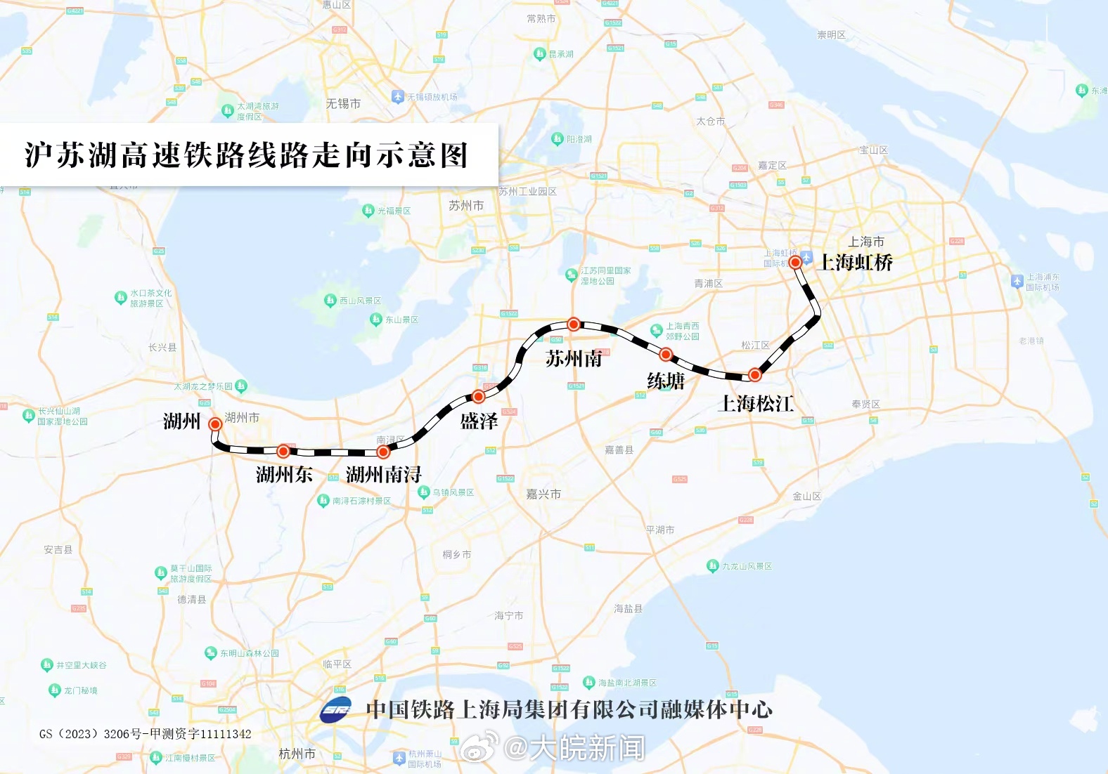 沪苏湖高铁自上海市上海虹桥站引出,途经江苏省苏州市,终至浙江省湖州市湖州站,线路全长164公里,设计时速350公里,设上海虹桥、上海松江、练塘、苏州南、盛泽、湖州南浔、湖州东、湖州站等 8 座车站,其中上海虹桥、湖州站为既有车站,其余为新建车站。沪苏湖高铁最高时速按350公里运营。