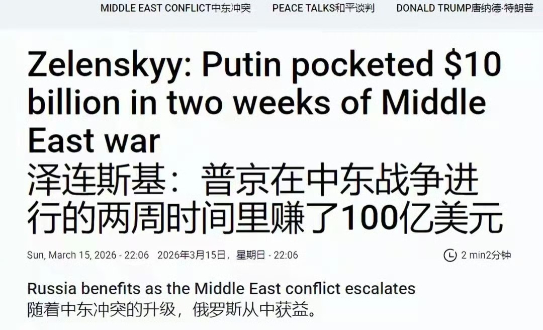 泽连斯基连声抱怨,普京在两周内就赚了100亿美元。