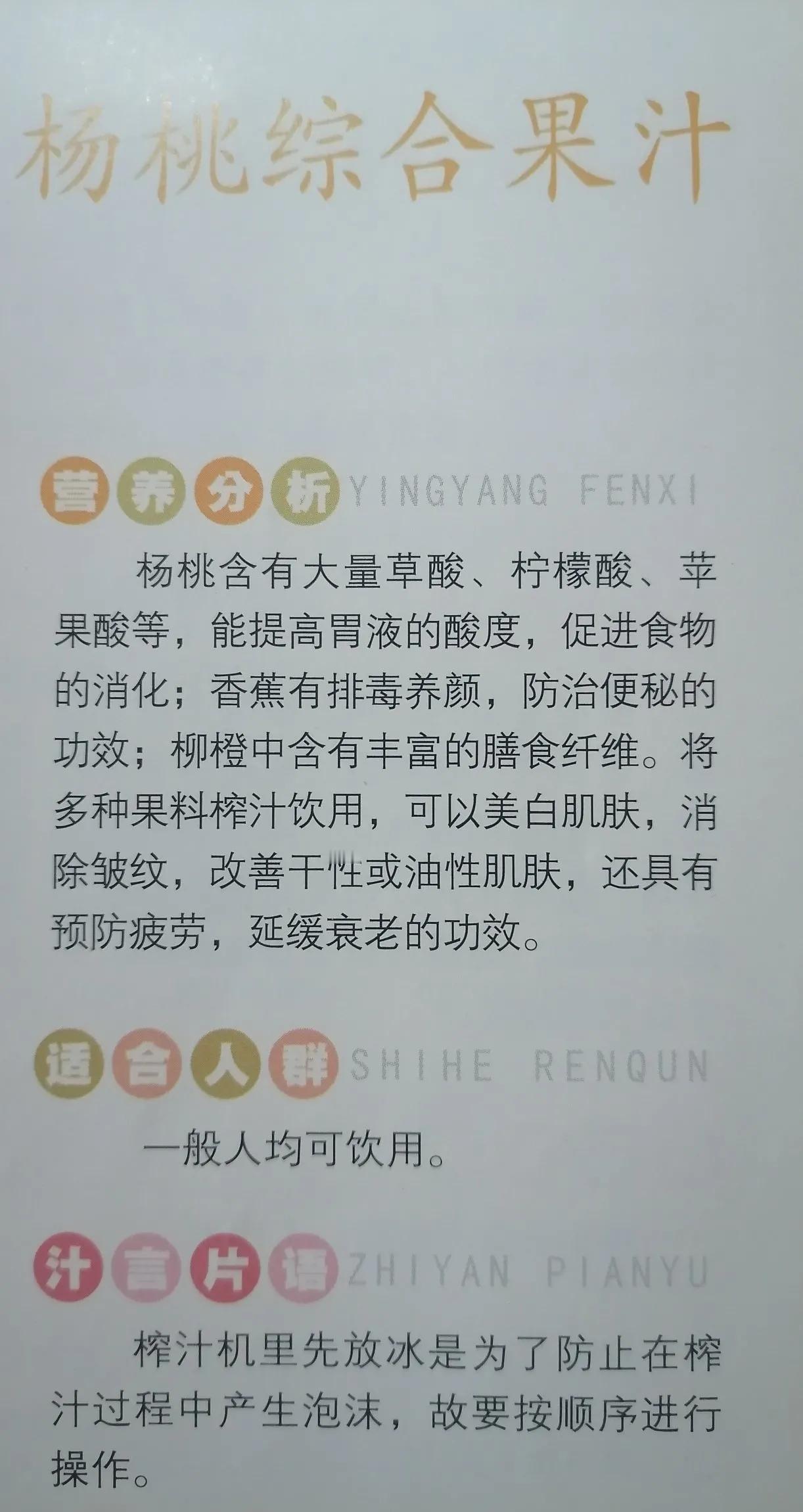 健康果蔬汁分享(5):杨桃综合果汁 杨桃综合果汁:排毒养颜,美白肌肤,延缓衰老。 材料:杨桃1个,柳橙1个,苹果1个,冷开水800毫升,冰块100克,蜂蜜适量。 制作过程: 1.准备材料: 杨桃洗净,去皮,去核,切成小块,待用; 柳橙去皮,切片,待用; 苹果去皮,洗净,去核,切成小块,待用。 2.先把冷开水和冰块倒入搅拌机中,搅打起氧泡,再把切好的水果块一起放入搅拌机中,启动果蔬键搅打2分钟。 3.把蜂蜜加入搅打好的果汁中,搅拌均匀,再把果汁倒入杯中,即可享用。