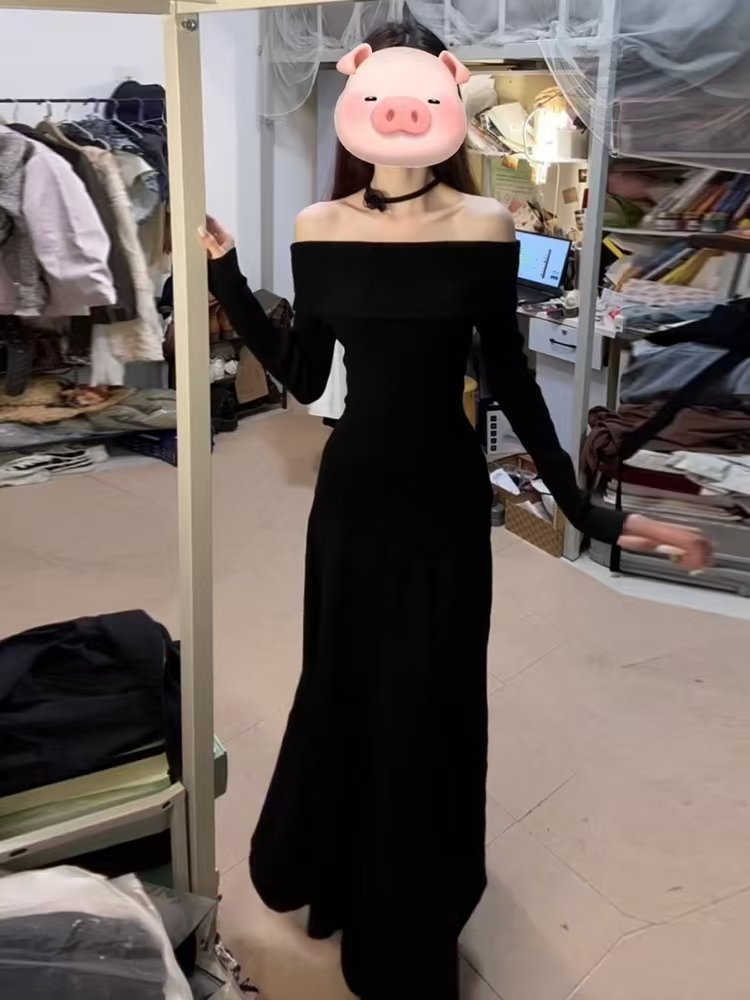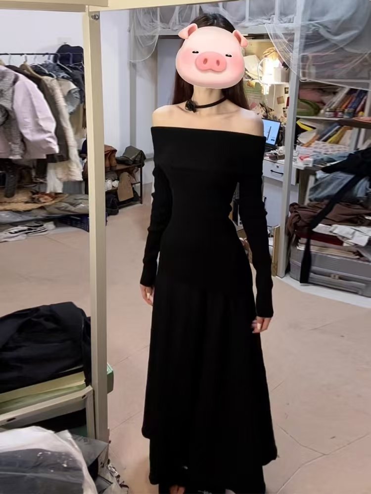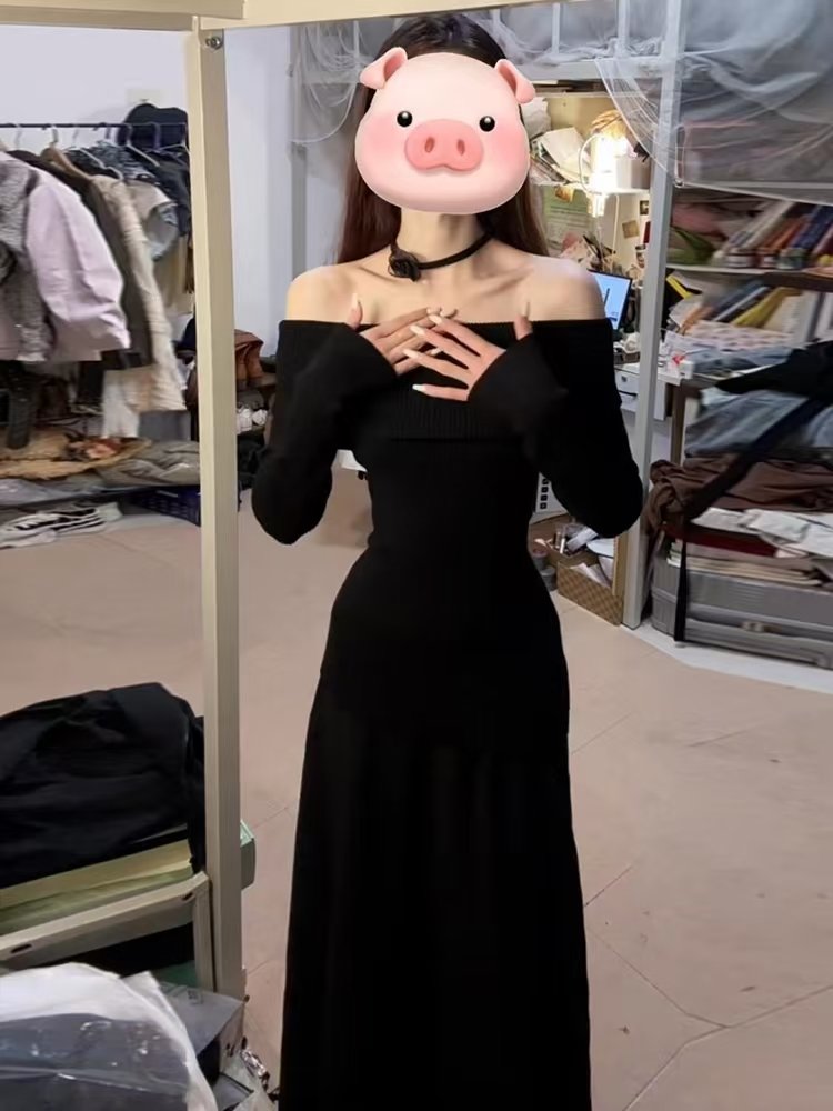 黑色战袍一字肩针织连衣裙好辣妹穿搭