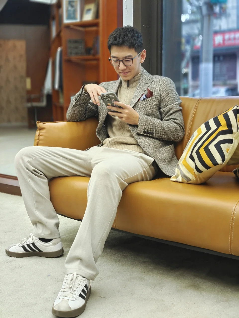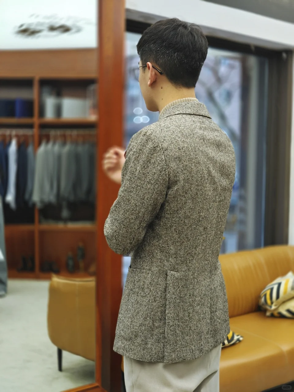 春节期间,见家长。怎么穿?挺烧脑的。衣品见人品对吧。品质感要好,又不能过于夸张隆重显得很拘谨。和女朋友去西装店看了下,是西康路上的lord of suits,跟小姐姐沟通了一下诉求,小姐姐推荐了单西配羊绒衫,没想到搭配起来效果很好,西装上衣让整体看上去有正式度,绒绒的质感也很好,色调显得温馨又亲切。被偷拍几张,穿上不显拘束,裤子鞋子就穿自己的日常,最后定装GET!