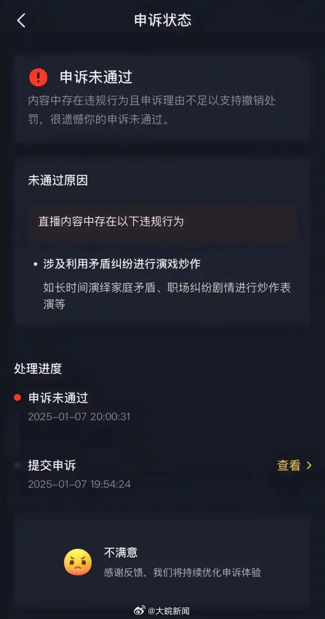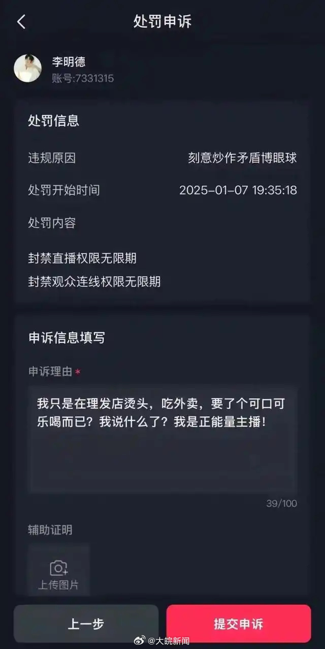 #李明德直播间被永久封禁#【#李明德直播间刻意炒作矛盾被封#】1月7日,演员李明德在个人社交账号发文称,自己的直播间被永久封禁了,原因是“刻意炒作矛盾博眼球”,处罚内容为:“封禁直播权限无限期,封禁观众连线权限无限期”。对此,李明德表示自己已向平台提起申诉,称自己只是在理发店剪头、吃外卖,“我说什么了?我是正能量主播!”随后,李明德再次发截图表示自己申诉失败,并表示自己会反抗到底。截图显示,申诉未通过原因为:涉及利用矛盾纠纷进行演习炒作,如长时间演绎家庭矛盾、职场纠纷剧情进行炒作表演等。