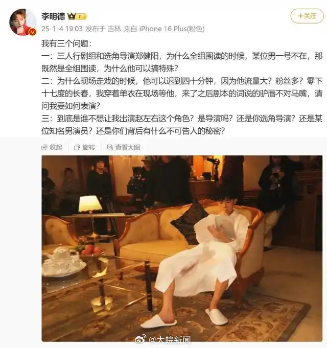 据此前报道,1月4日,李明德提出三个疑问,称全组围读的时候,男一号缺席,主演耍大牌。现场走戏时,他穿着单衣在零下十七度的长春等了40分钟,男主角来了后,台词却说得驴唇不对马嘴。