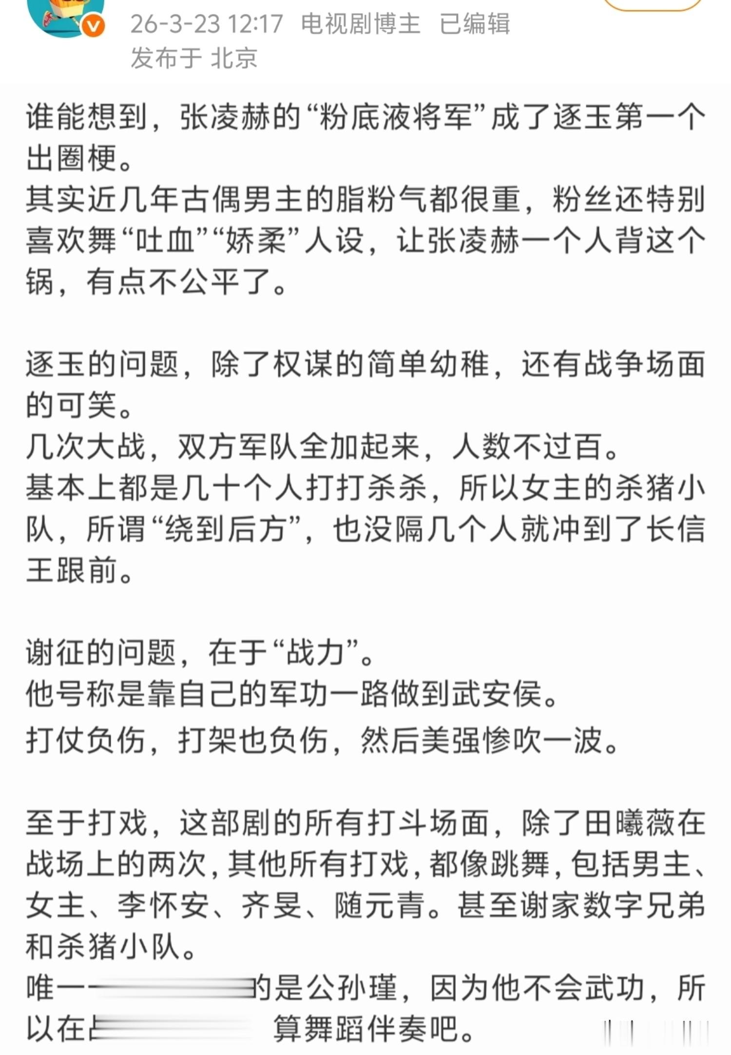粉底液将军是什么?指张凌赫在《逐玉》中饰演的武安侯缺乏阳刚之气,妆容过于精致,比起打仗更像是去走秀。