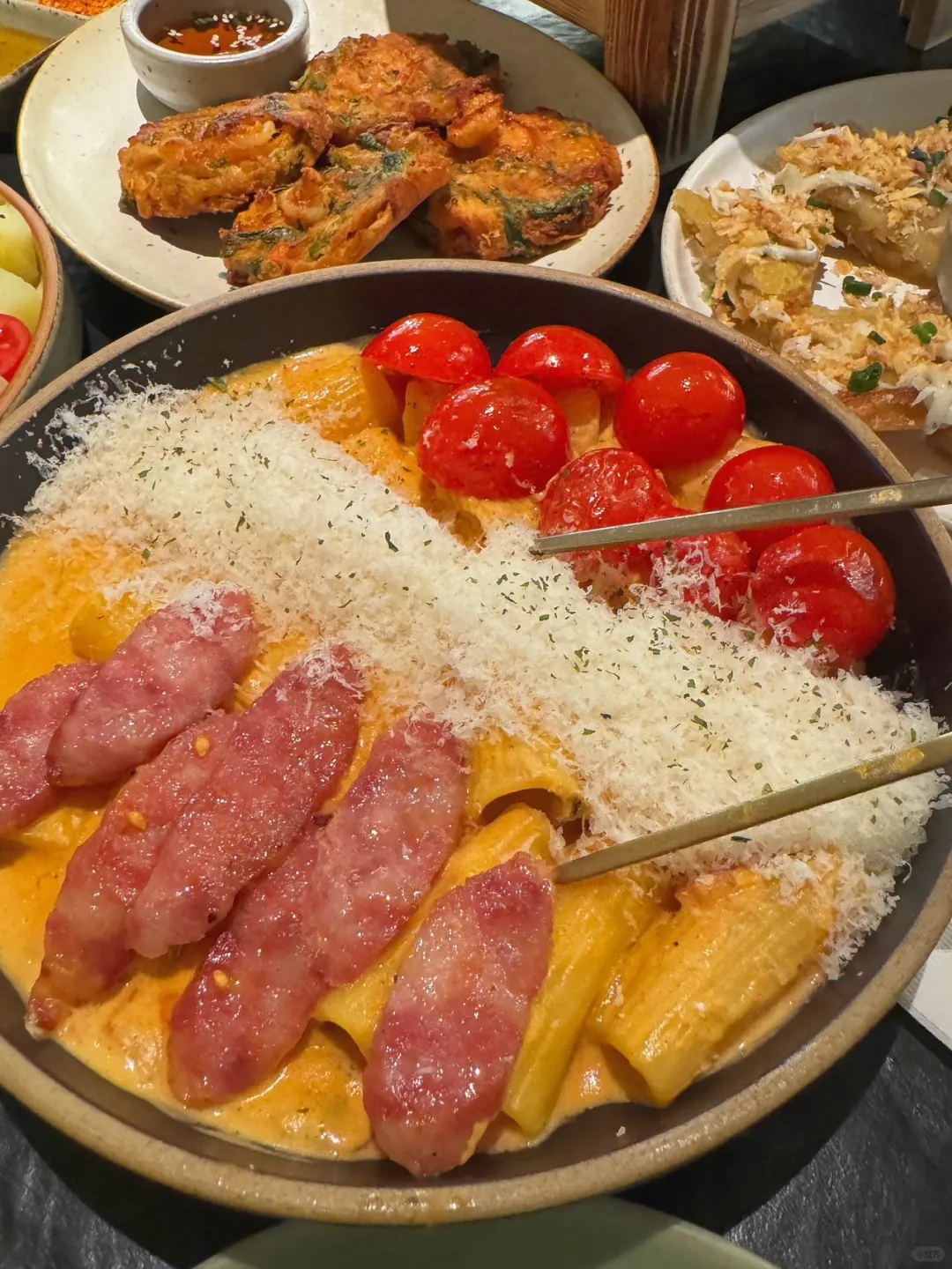 管状的意面裹满芝士浓郁的酱汁,一点点辣味的口感,不会吃多有腻感