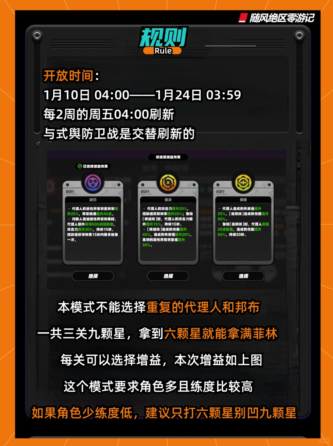 大家早上中午晚上好,我是随风 今天给大家带来的是第二期「危局强袭战」攻略 这是一个只打BOSS的模式,难度比较高,而且不能用重复的代理人和邦布 一共三关九颗星,拿到六颗星就能拿满菲林 如果你练度低或者角色少,建议只拿六颗星,可选择在某两关凹满三颗星,或者三关平均每关拿到两颗星以上