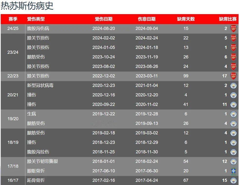 加盟阿森纳两年多时间,热苏斯已先后7次受伤,缺席时间超过420天,至少错过55场比赛。目前热苏斯身价为4500万欧元。热苏斯和阿森纳合同将在2027年夏天到期,周薪26.5万英镑,仅次于28万的的哈弗茨。结合伤病、出勤率、进球等数据,热苏斯显然达不到争冠首发前锋的标准。这个位置枪手必须继续砸钱。