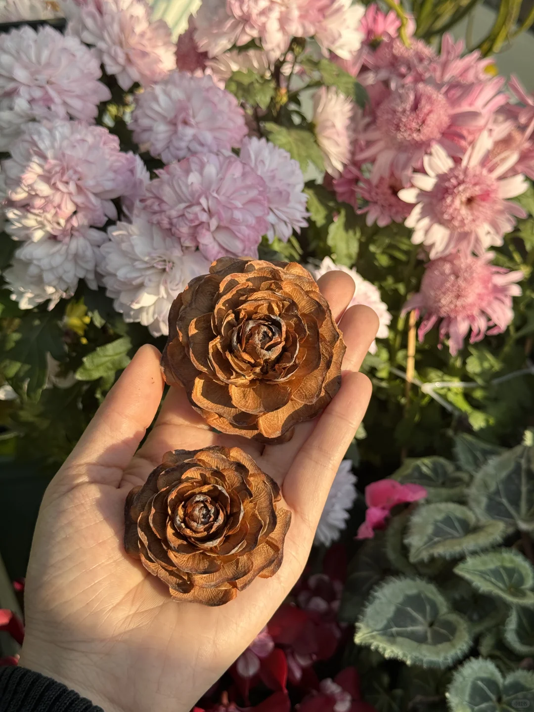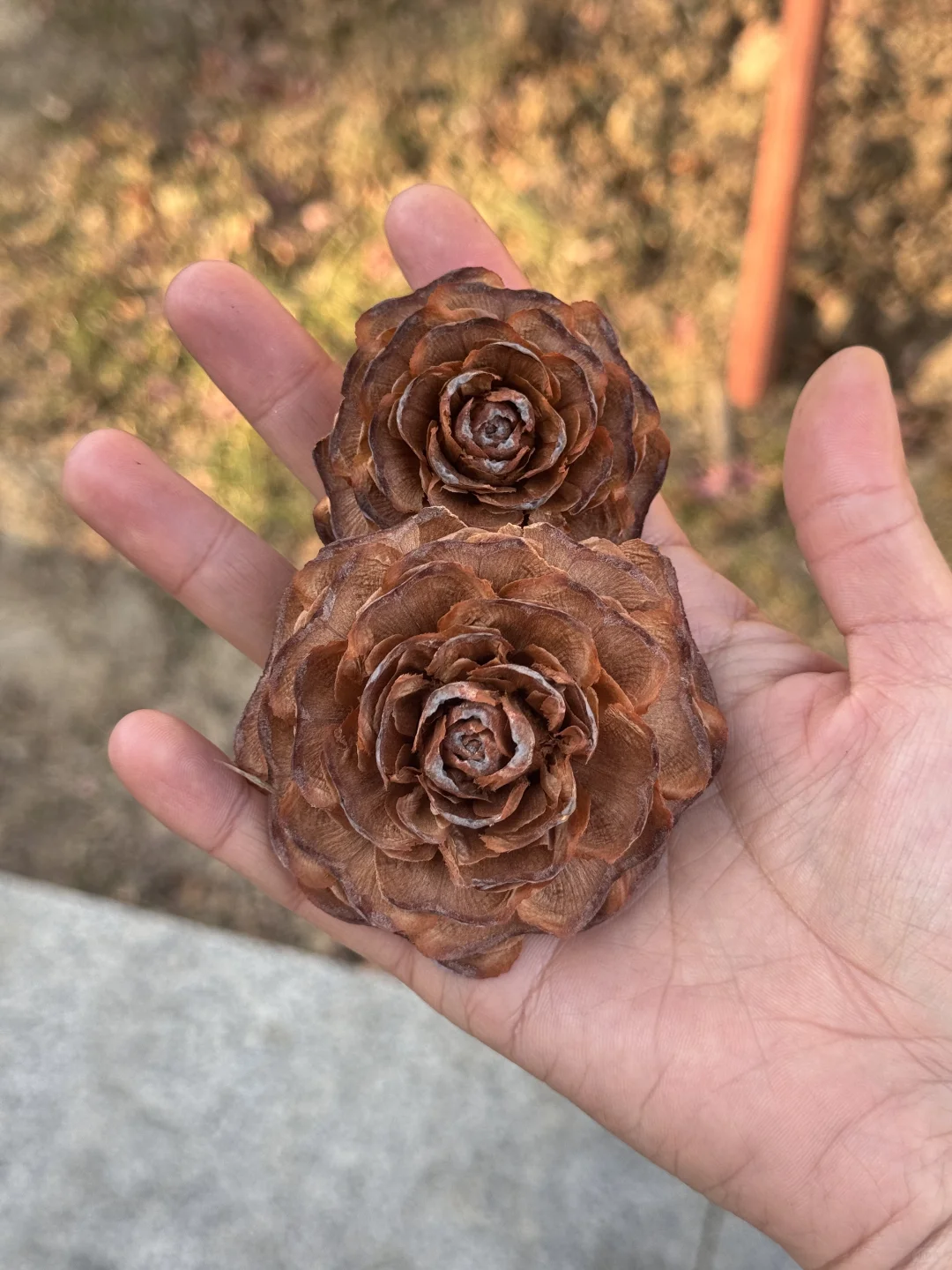竟然在家门口的公园捡到两朵雪松玫瑰[萌萌哒R] 虽然今天气温很冷!但是心里好暖[黄金薯R] 之前刷到过雪松果的图片只觉得圆鼓鼓的很可爱 一直想捡小球球的无奈家门口的树太高… 每次果子自然掉下来就碎成好几瓣了…[哭惹R] 今天居然在无意之下捡到了两个[飞吻R] 应该是前几天公园修剪的时候弄下来的~ 园艺工也是懂浪漫的,丢在花坛角落里 等着我这个有缘人来发现它们[大笑R]