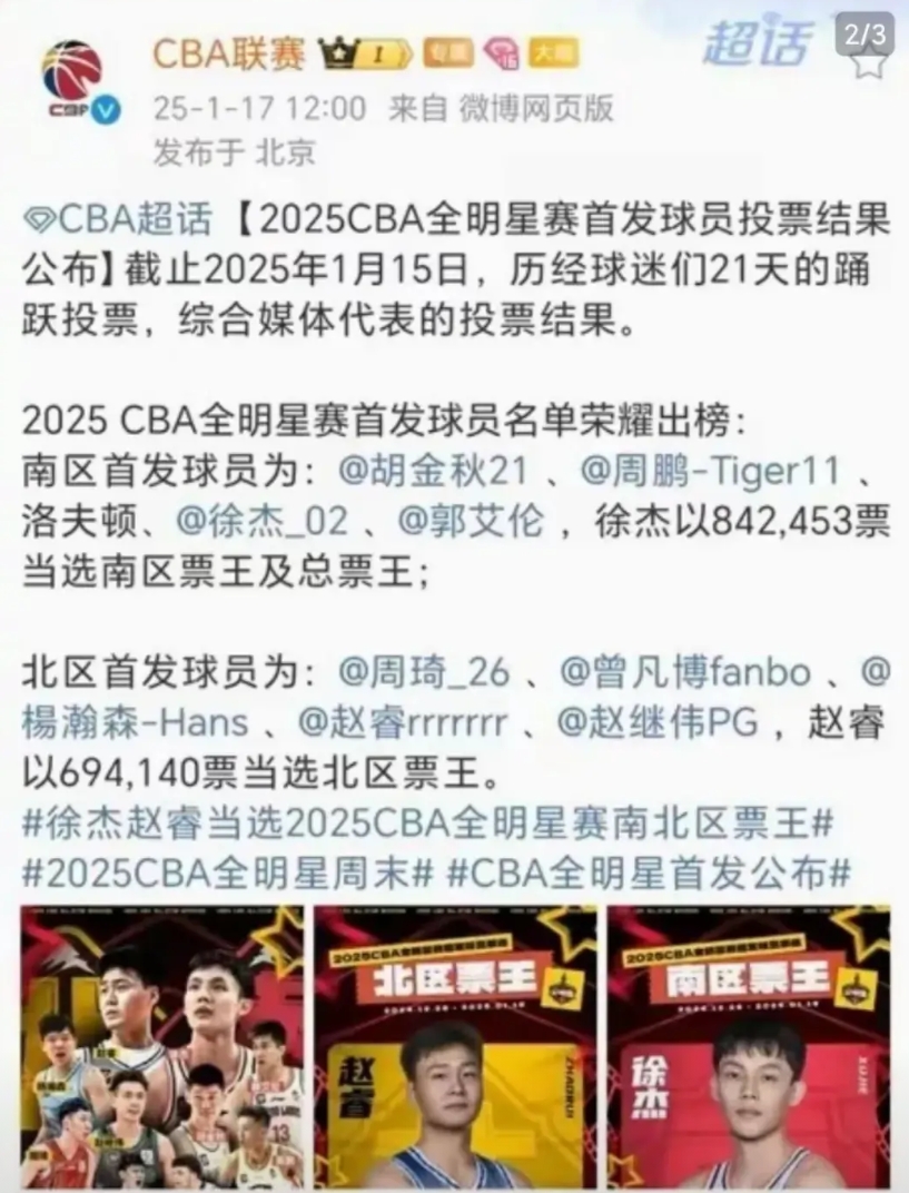 今日中午12点,CBA官方公布了全明星票选结果,广东队球员徐杰以842,453票南区票王,总票王。新疆队球员赵睿以694,140票获北区票王。 杰师傅获得全明星总票王,实至名归!可喜可贺!上赛季总票王是广东队的胡明轩,而北区票王赵睿原是广东队球员。赵睿、胡明轩、徐杰在广东队有黑白矮三少之称,并先后成为国家队球员。 恭喜杰师傅!恭喜黑睿!