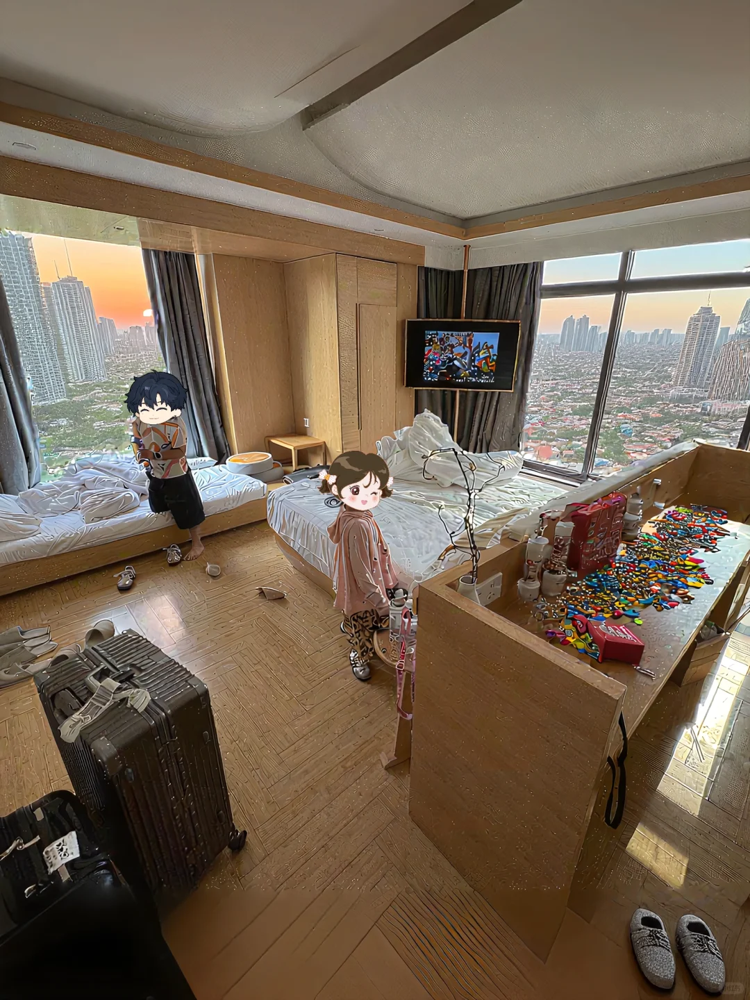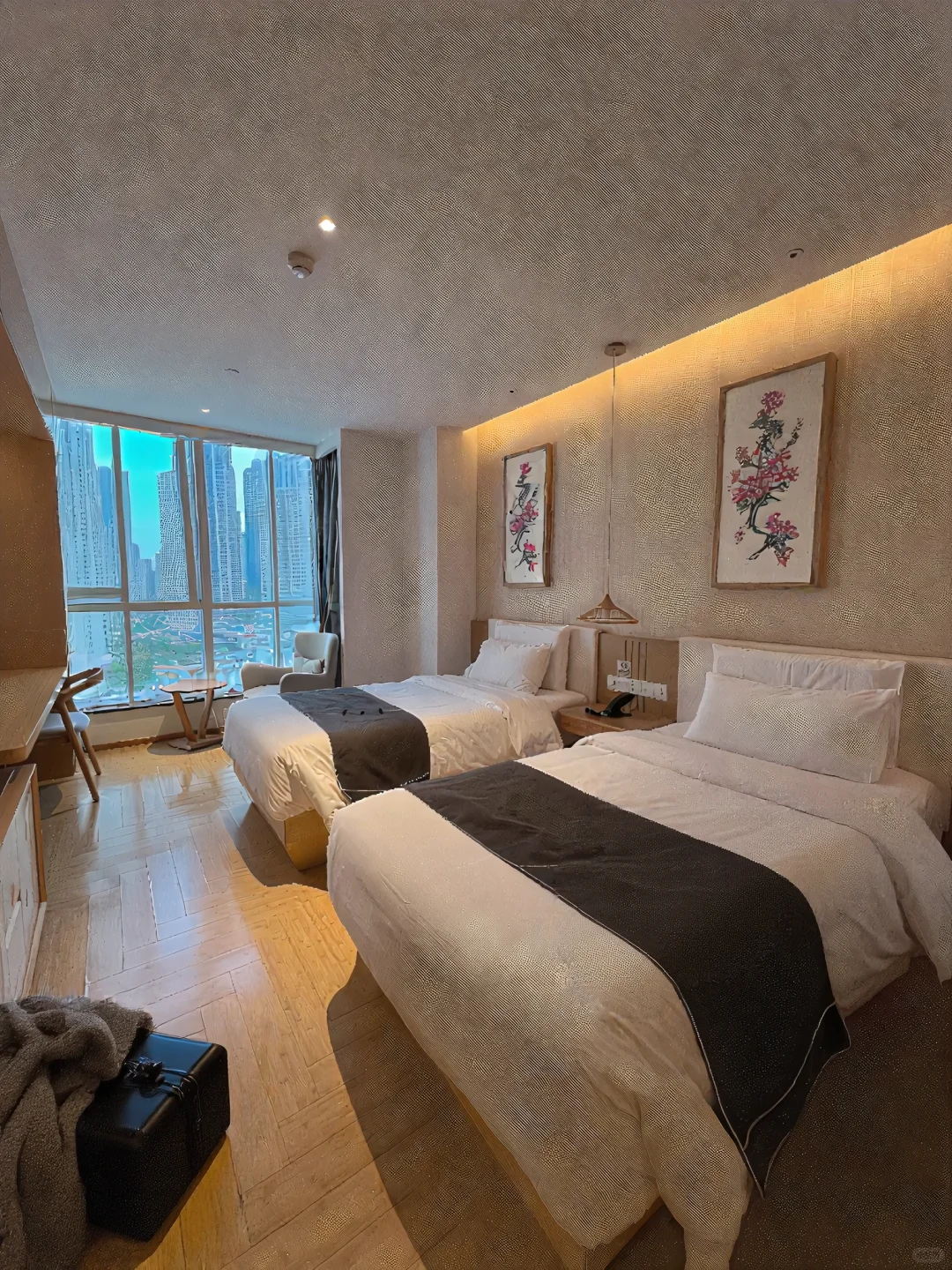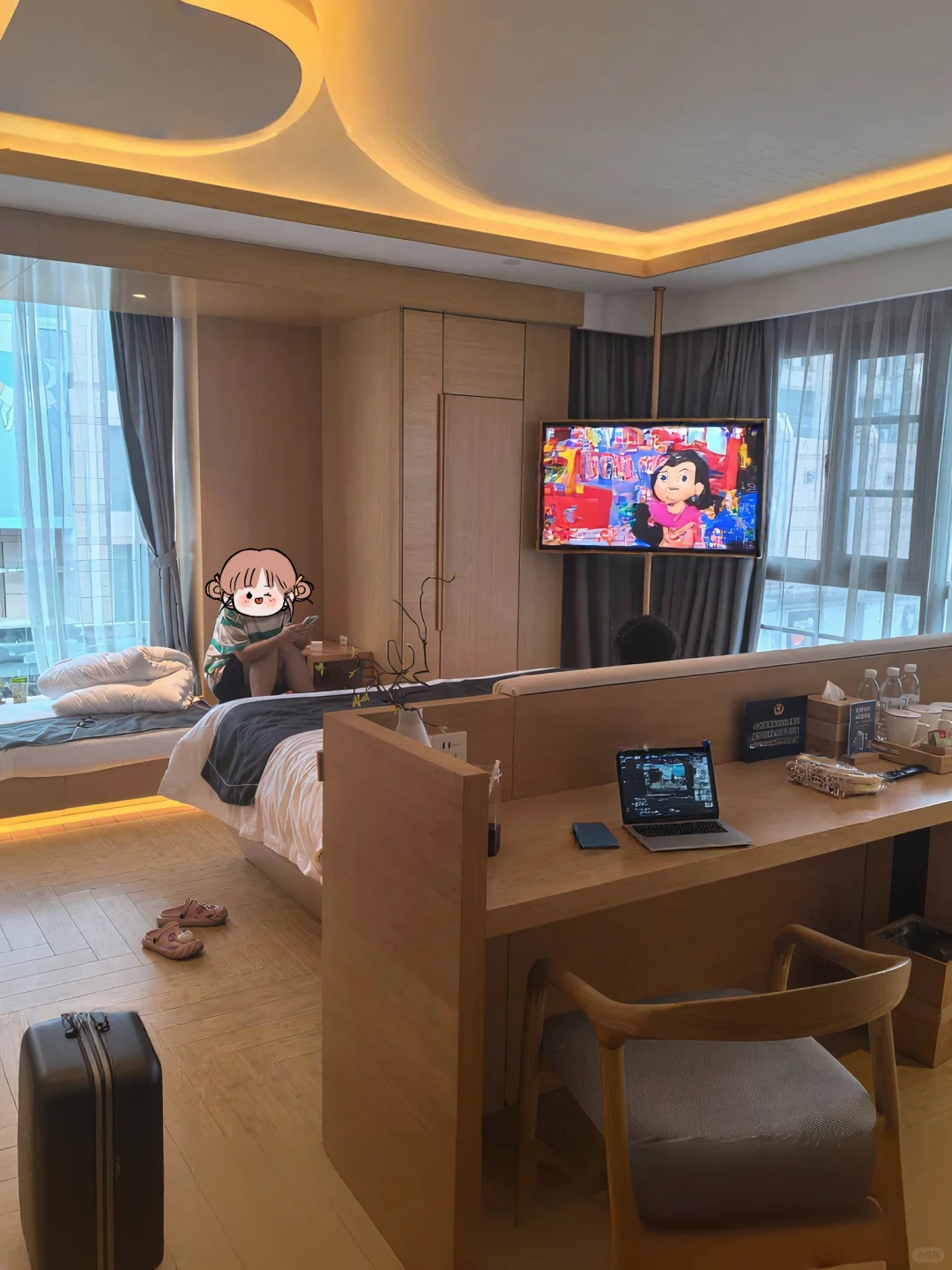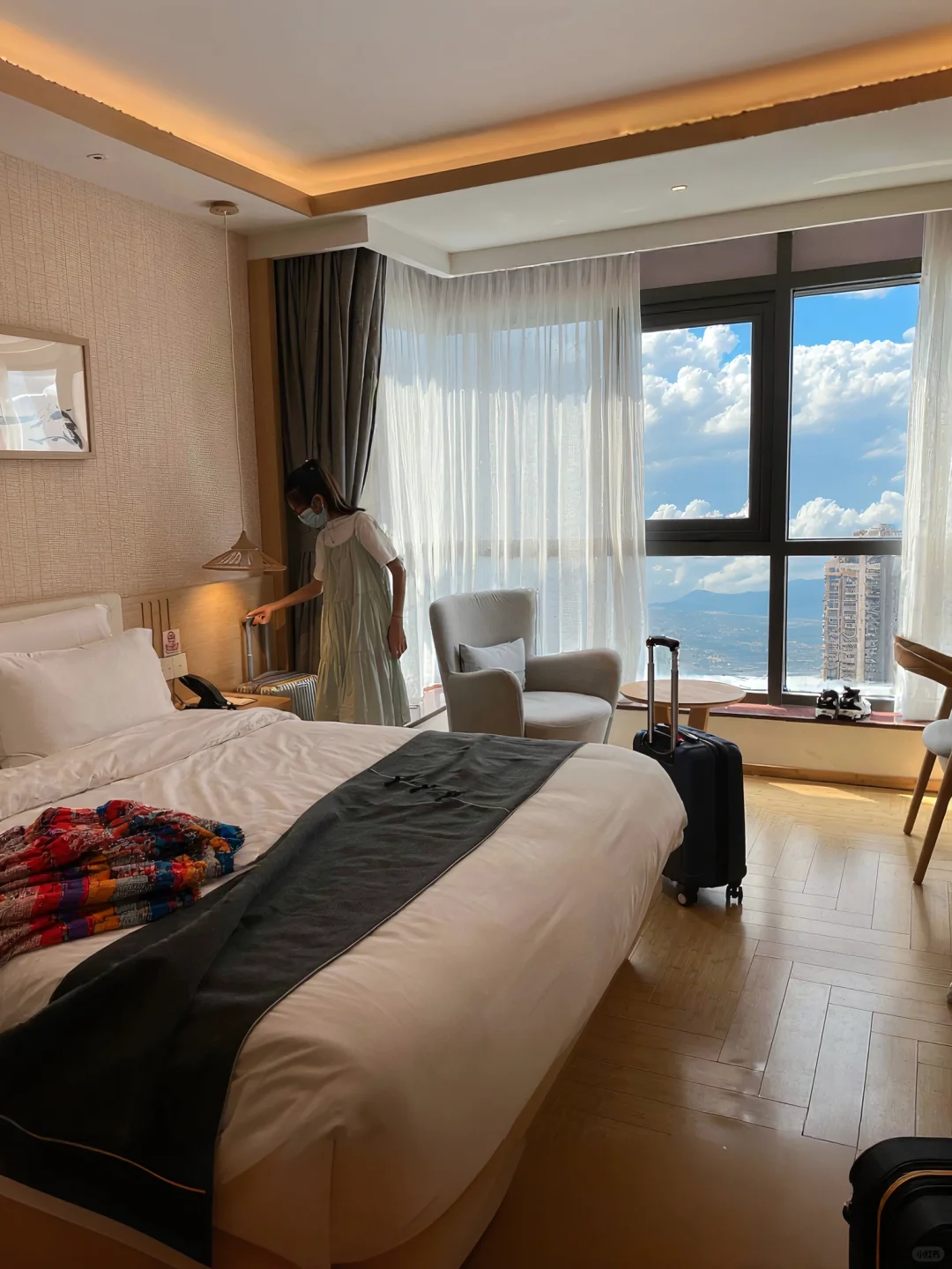 2⃣房间空间很大方方正正的,大面大窗户,采光好👍原木风+暖色调房间唔舒服,床垫软软的很舒服,床品干净一客一换;卫生间干湿分离,还有大浴缸可以泡澡,玩一天泡个热水澡,很舒爽~