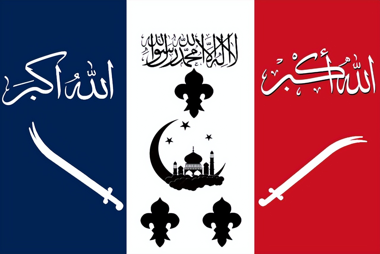 网友恶搞,法国国旗+阿拉伯语+阿拉伯弯刀+清真寺