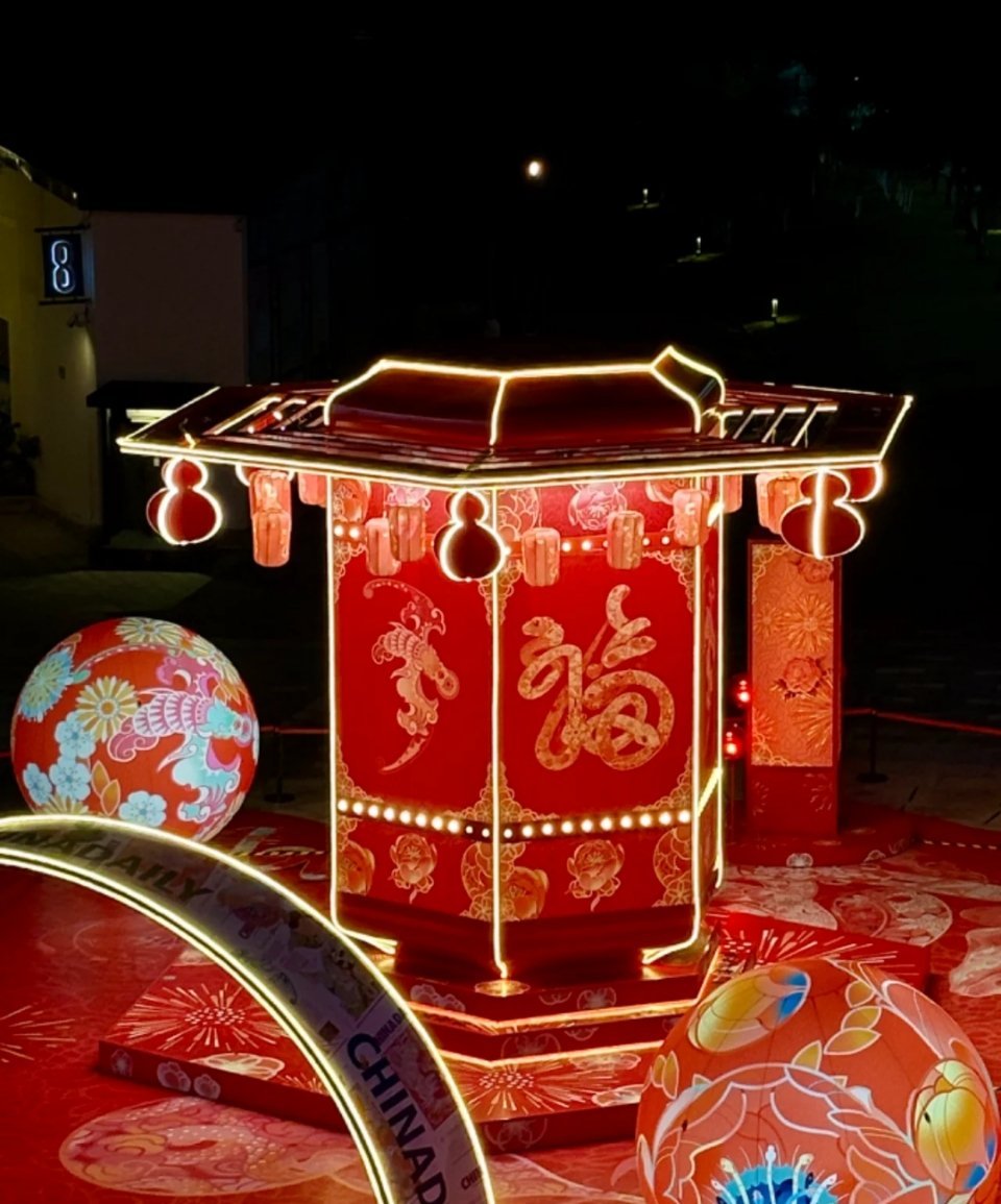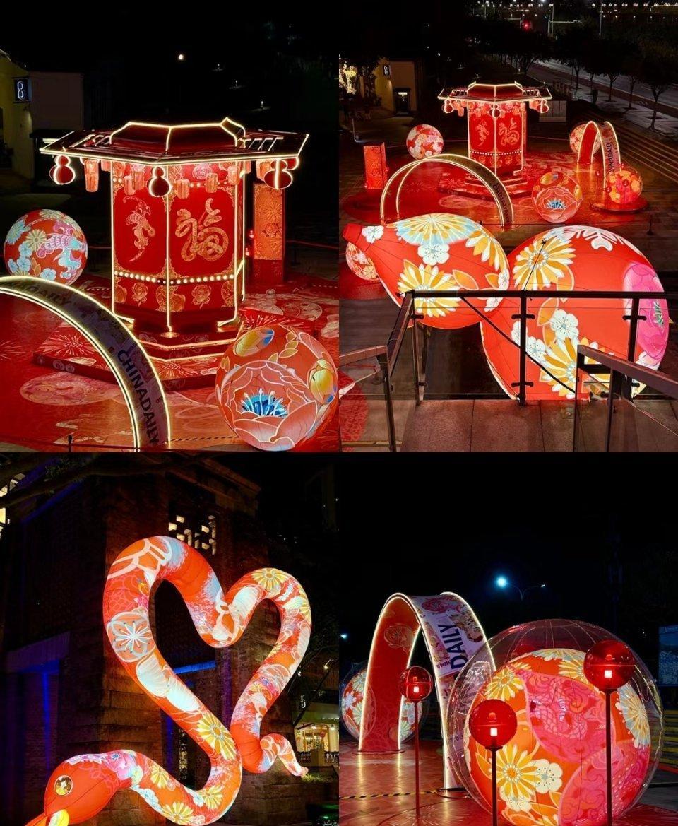 一眼望去,到处都是新年的祝福与期盼最吸引人的是那巨型的蛇型气模口含金币,寓意新的一年财源滚滚,还有红红火火的福字花灯