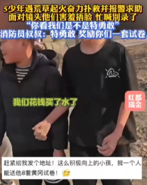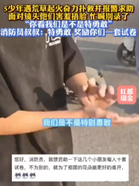 一个小男孩有点不好意思地用手捂着脸,但眼神里却充满了自豪,怯怯地问:“我们是不是特勇敢?”消防员肯定地回答:“特勇敢!”紧接着,消防员叔叔又补充了一句:“可以告诉你们老师,奖励你们一套试卷!”
