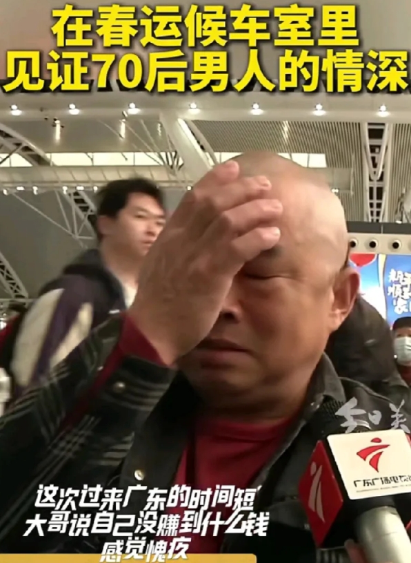 2、在广州车站,一位70后大哥在接受采访时,潸然泪下,因没挣到钱而愧疚,非常想家,但更要养家。每个外出的人身上都背负着一家人的生活希望。愿平安,愿越来越好。