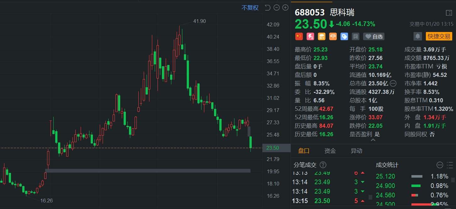 思科瑞(688053.SH)大幅下跌超15%,现报23.5元创去年10月中旬以来新低,总市值23.5亿元。消息上,上周五晚间,公司披露了四川证监局下发的《行政监管措施决定书》,以及中国证监会的立案告知书。相关报道显示,上交所将持续跟进思科瑞被立案调查情况并采取纪律处分措施。据了解,上交所将持续提高对财务造假行为的发现和防范,从严打击,切实维护资本市场风清气正的环境。前期,上交所已对思科瑞2023年年报、2024年半年报进行两次公开问询。(格隆汇)